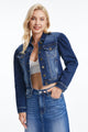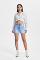 This denim mini skirt for women is a new favorite. It features unique bear-ear patch pockets, distressed details, and a raw hem for a stylish, playful look.