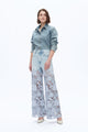 High rise embroidered relaxed straight jeans, five-pocket style, front with irregular hand-faded finish and plant-style cutout embroidery