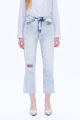 These high-waisted denim jeans feature distressed details on both the front and back pockets, with a stylish slit design at the hem. The standout feature is the unique pocket placement that you'll absolutely love.