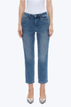 High-rise flare jeans in deep blue stretch denim with frayed pocket edges, hand-faded whiskering, and stylish side slits for a chic retro vibe.