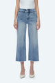 High-waisted straight-leg jeans crafted from low-stretch denim in a mid-blue wash. Featuring a zip fly closure, classic five-pocket design with heavy frayed edges on the pocket openings, and strategically placed distressed details. The front panel showcases whiskering and hand-faded effects for a worn-in look. The hem is folded with side slits for added style. A perfect blend of classic design and modern details.