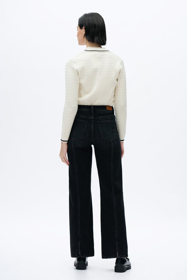 Cropped high-waisted wide-leg jeans in low-stretch denim. Designed with slant pockets, thigh slits, back hem slits, a center seam for added dimension, zip fly, irregular whiskering, and hand sanding.