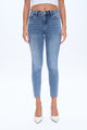 Cropped high-waisted wide-leg jeans in medium stretch denim. Designed with a classic 5-pocket silhouette, frayed pocket openings, zip fly closure, symmetrical whiskering, hand sanding, raw hem, and a dramatic side slit.