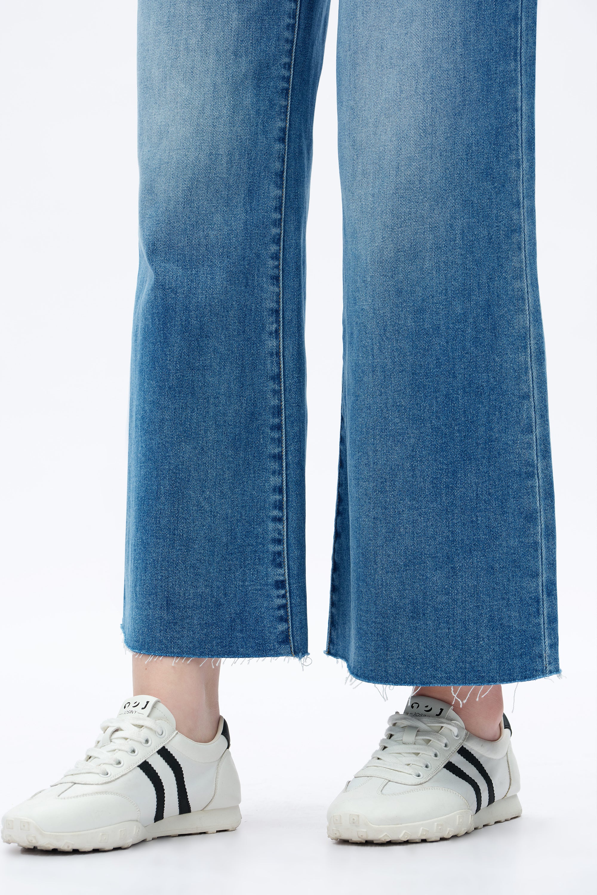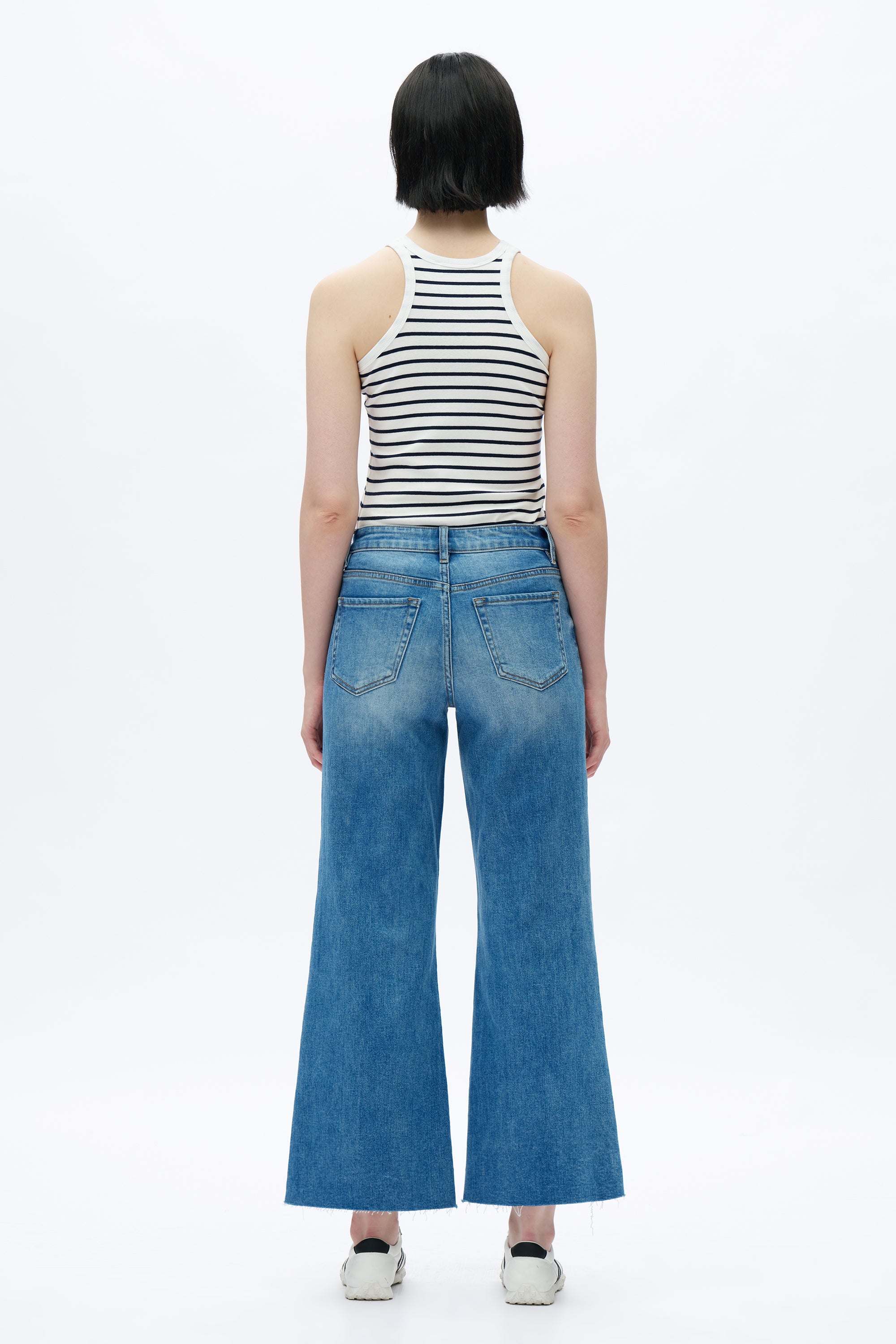Our stretchy wide-leg denim with a high-waisted design features whiskering and fading effects, and has a frayed hem detail.