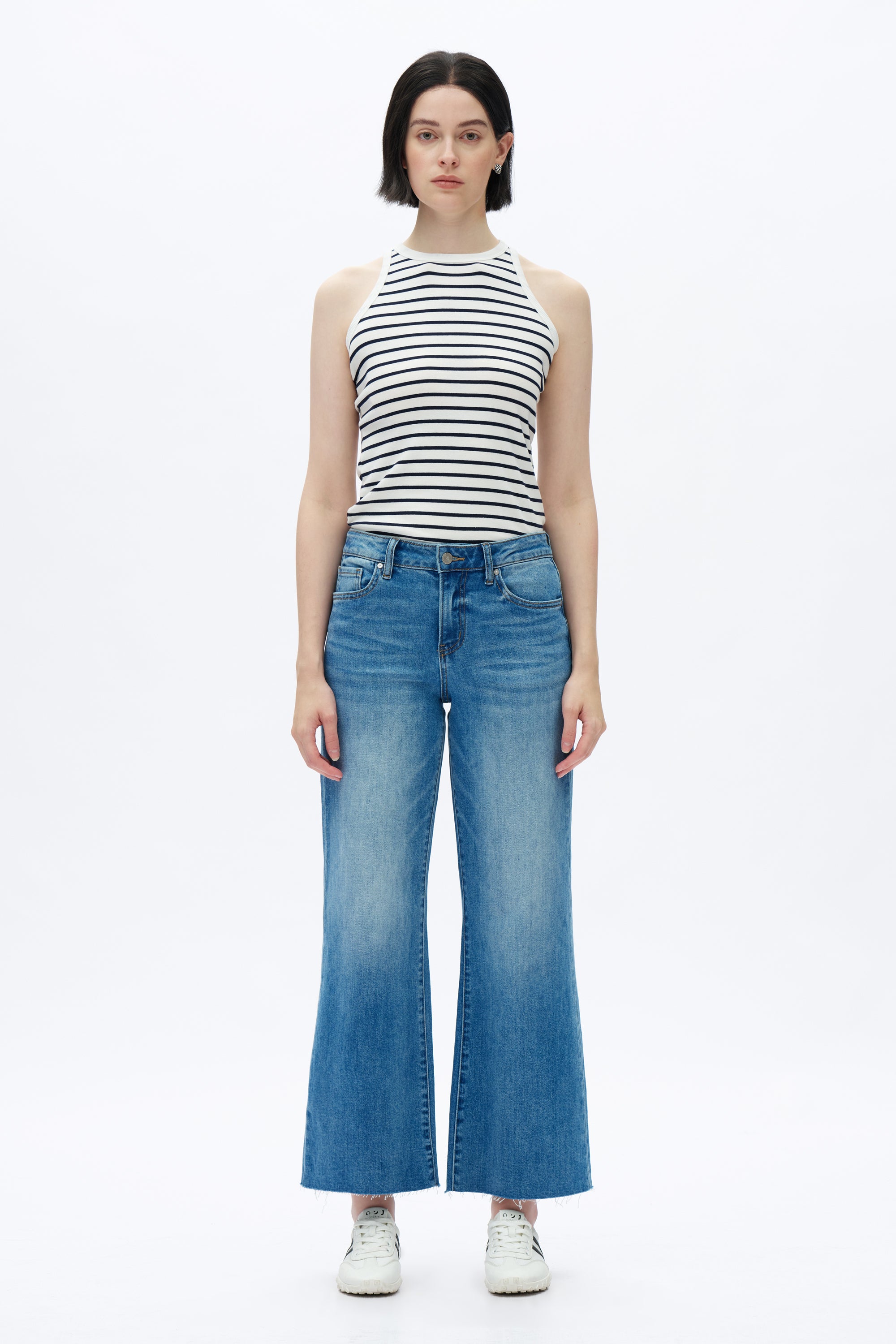 Mid Rise Wide Leg Denim Jeans With Raw Hem
