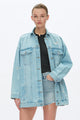 Loose-fitting patchwork jacket, medium blue washed color, corduroy fabric on the collar, nostalgic plaid lining, several areas with handcrafted distressed design, giving a strong vintage vibe.