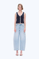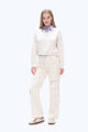 Mid-rise wide leg jeans in classic white denim. Features a five-pocket design with irregular patchwork details on the front and a clean folded hem.