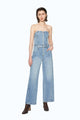 High-waisted flare jeans with detailed distressed pocket edges. Features vertical faded lines, whiskering, and frayed hems for a stylish, casual look.