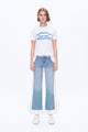 Low-rise, slim-fitting bootcut jeans made with super stretch denim. The front features gentle whiskers, creating a comfortable and stylish silhouette.