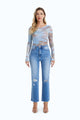 High-rise stretch mom jeans crafted with high-stretch denim. Features distressed knee details and a cropped length for a modern, laid-back vibe.
