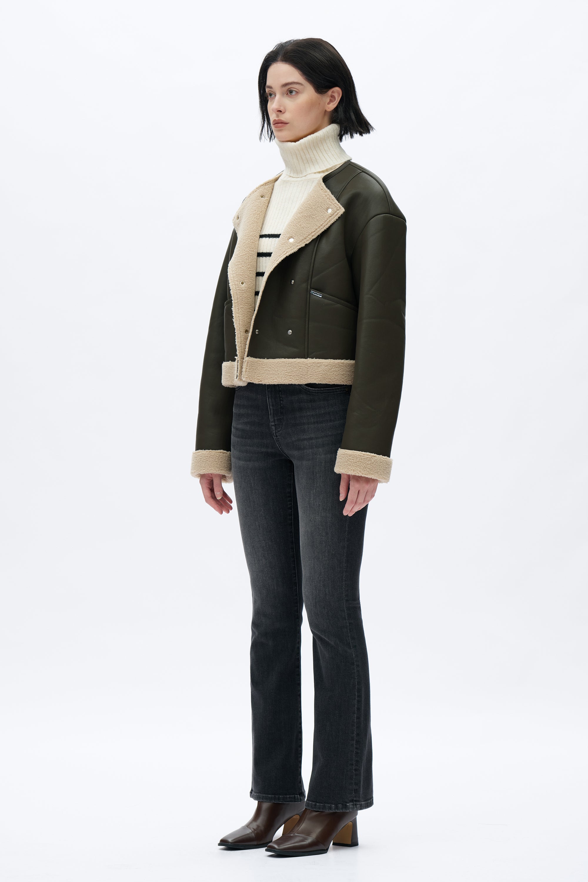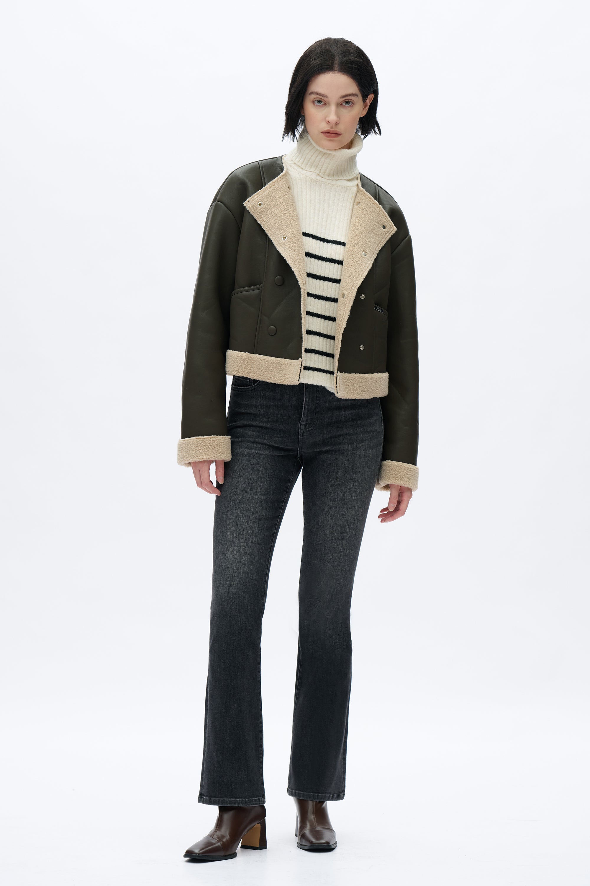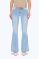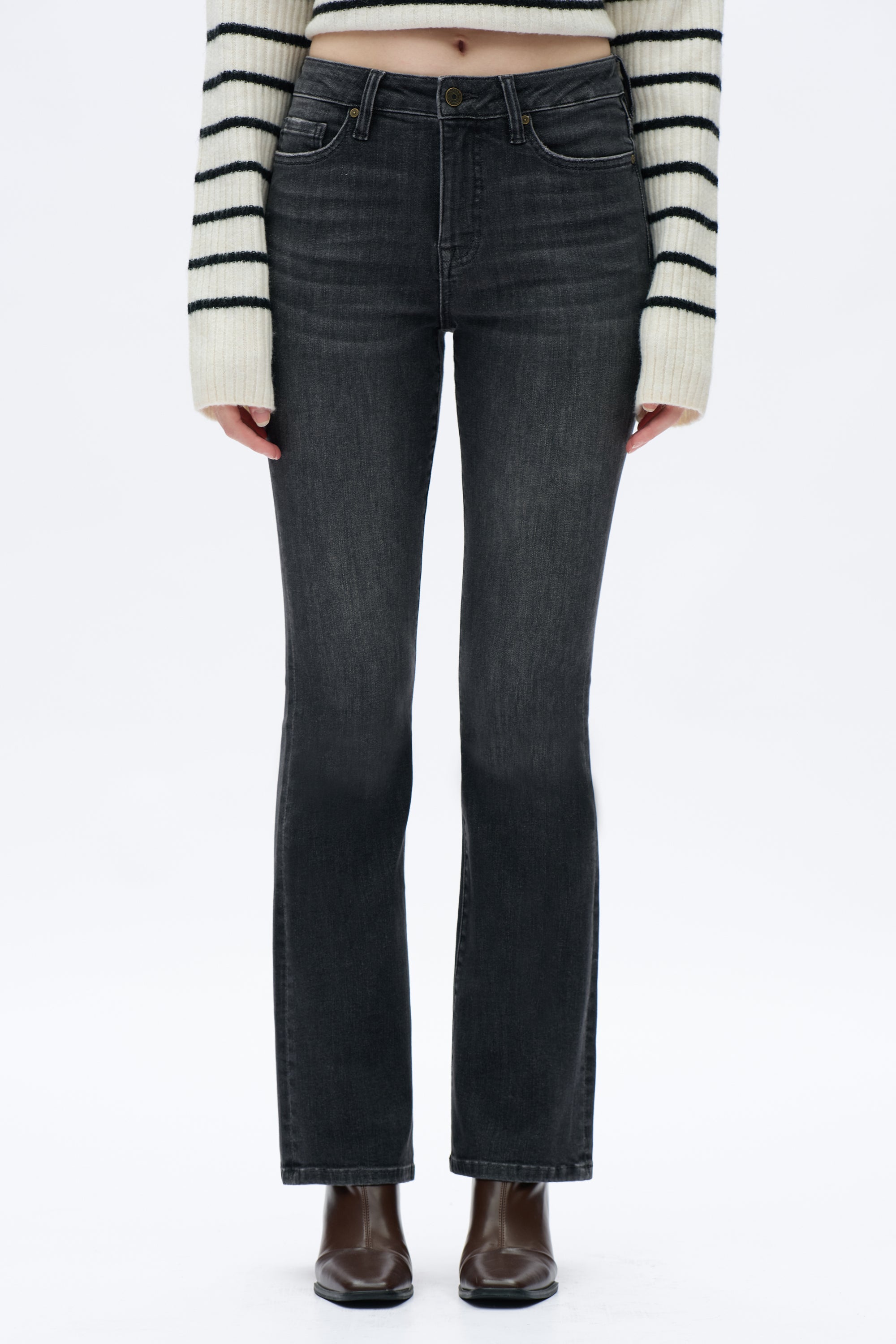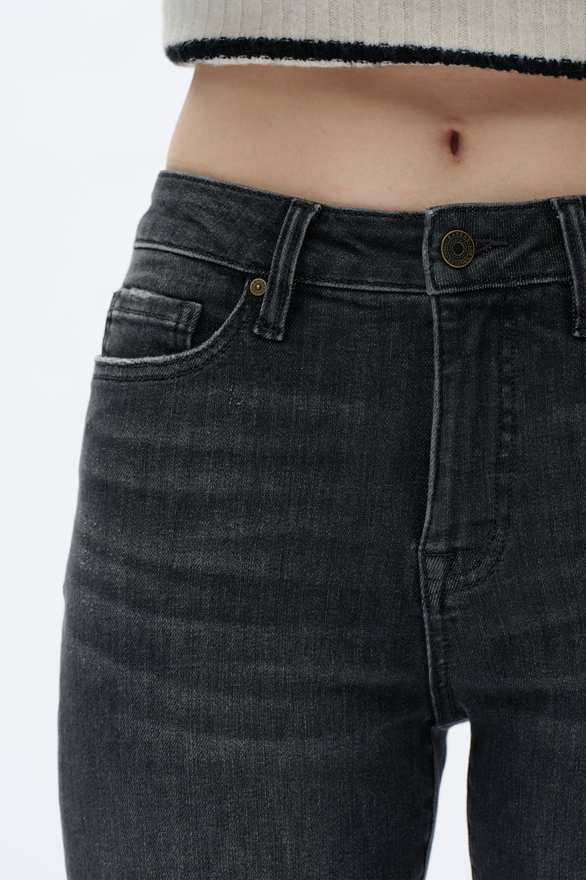 A pair of high-waisted bootcut jeans in a dark shade, these jeans boast frayed edges, horsehair effects, five pockets, and a clean hem, all made possible by stretch denim fabric.