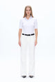 Cropped high-waisted wide-leg jeans in stretchy denim. Designed with a classic 5-pocket silhouette, contrast rivet waist closure, irregular whiskering, hand sanding, raw hem, and distressed back pockets with frayed edges.