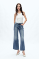 High-waisted denim flared pants crafted from stretchy denim. With whiskering and fading, this jeans offer a vintage-inspired design and comfortable fit.