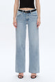 Mid-rise straight jeans in stretch denim with fading, whiskering, and raw hem—versatile style for chic everyday wear.