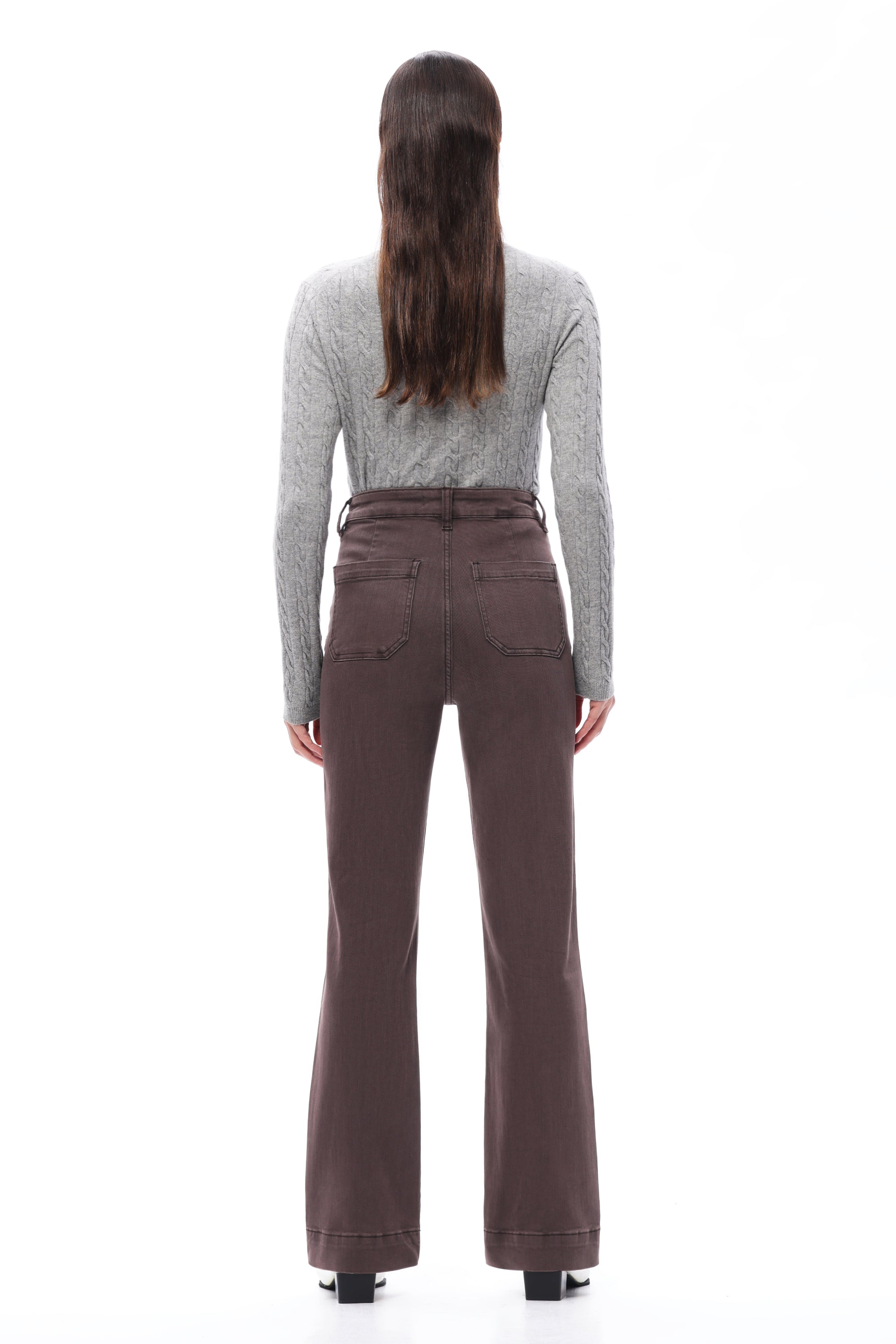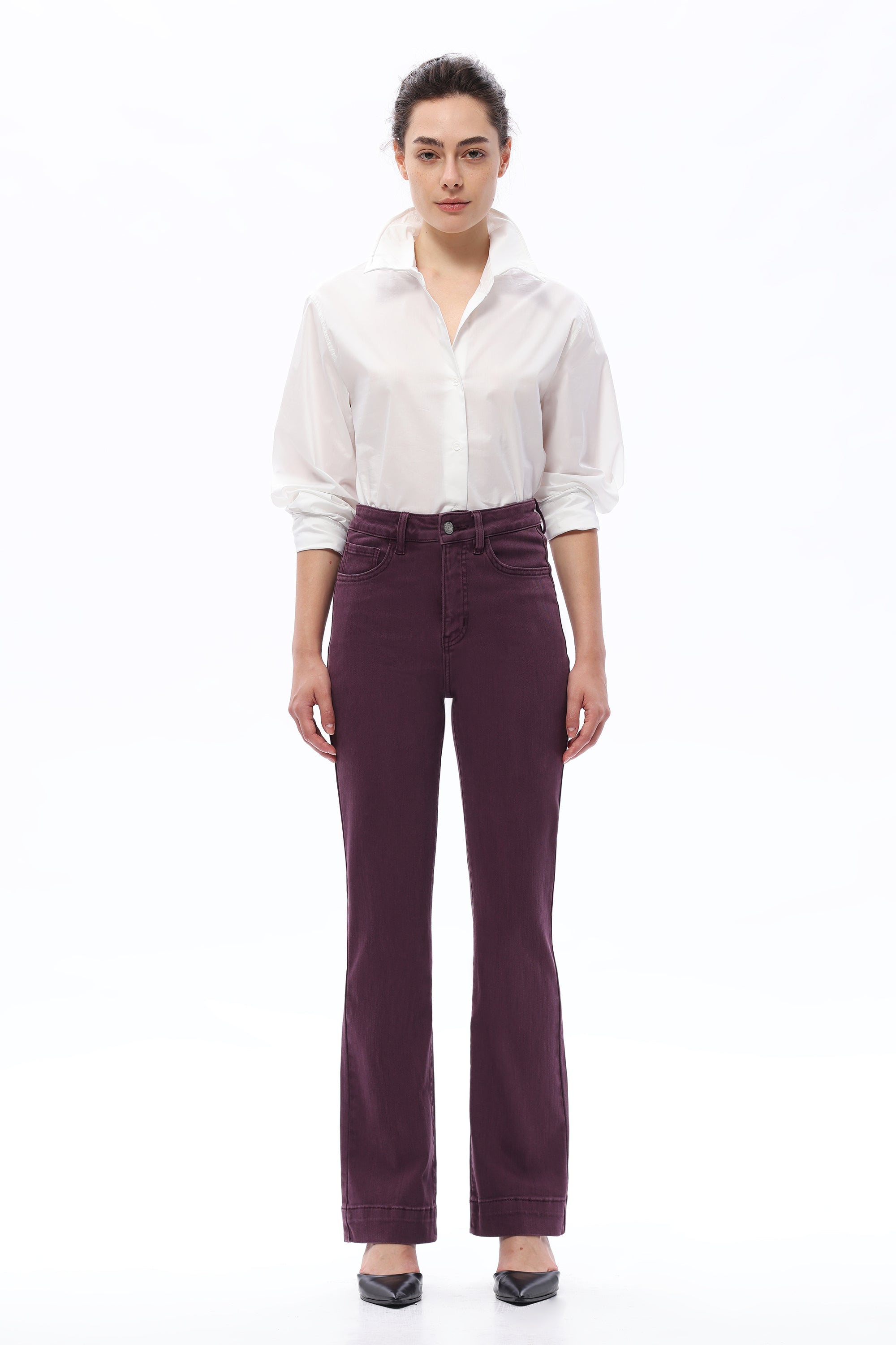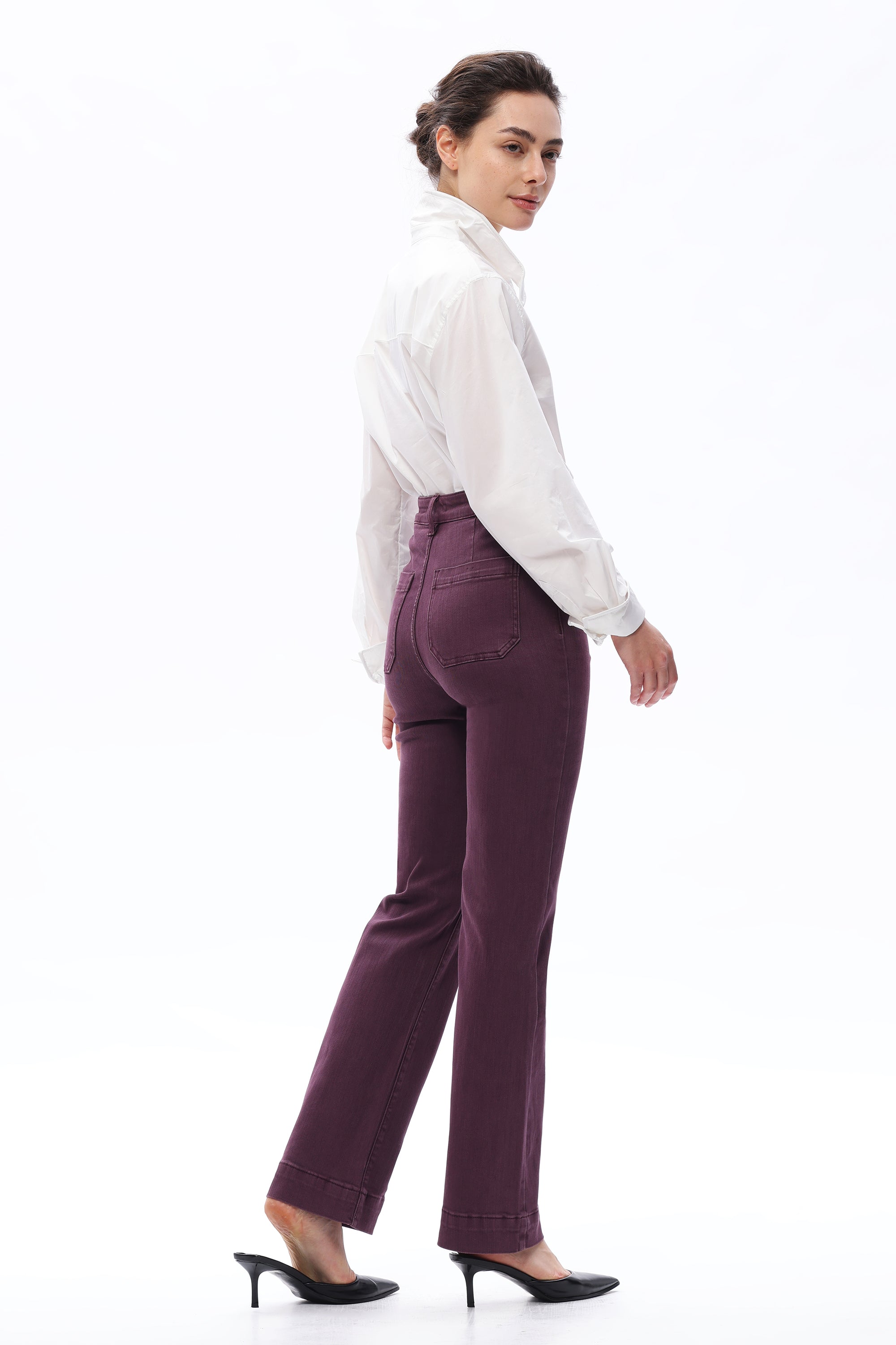 Super high rise stretch pants with tummy control pocket bag and back pockets ,Button closure and zip fly, full length with bootcut silhouette.