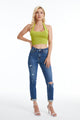 Standout flare pants with edgy ripped patch details, high-rise fit, and frayed hem for a bold statement look.