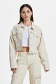 This patchwork denim jacket for women is a new favorite. It features trendy blue patches and a stylish frayed hem for a modern, edgy look.