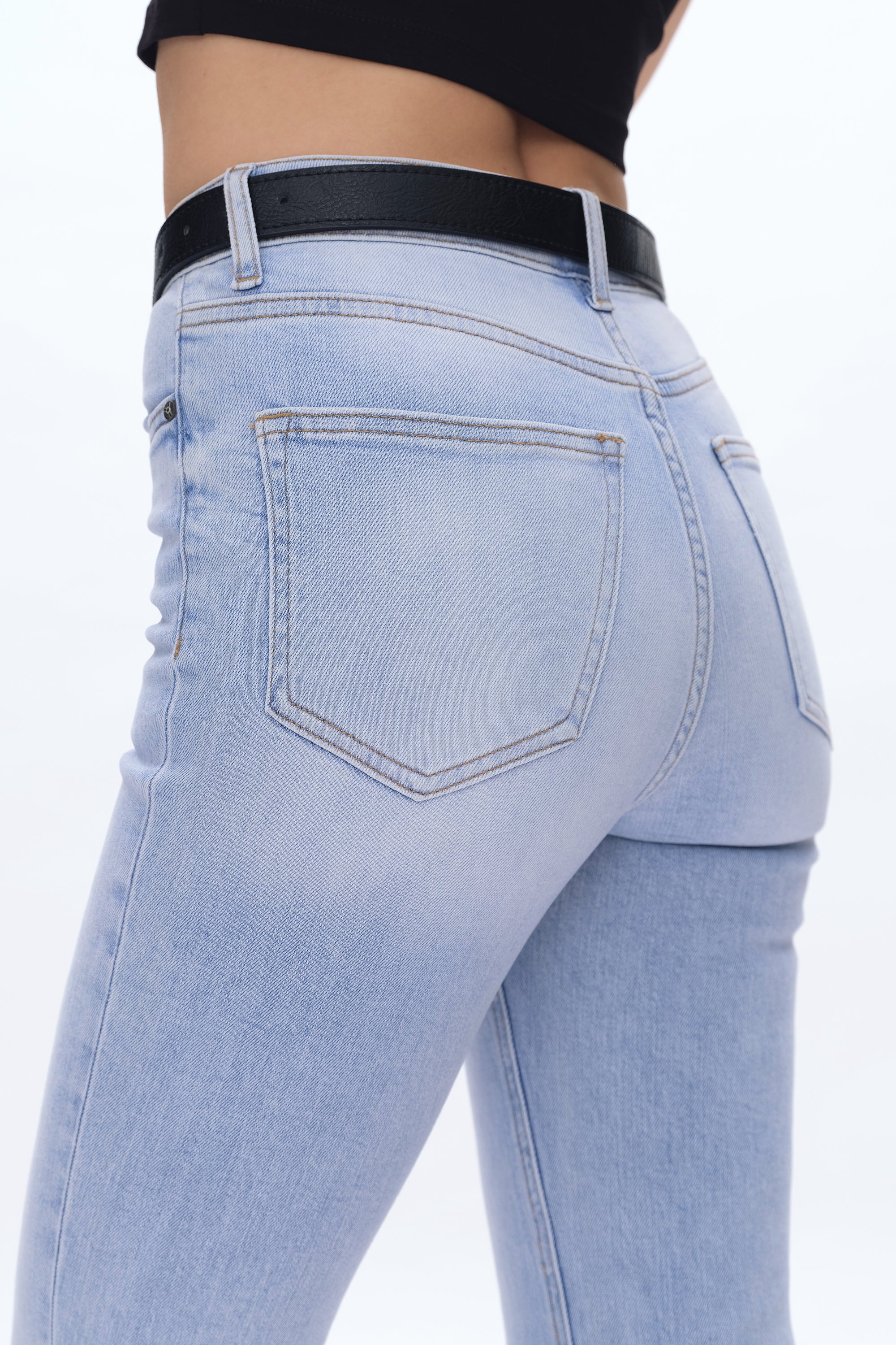 Classic straight leg denim with a flattering high rise fit and soft light wash, perfect for effortless everyday wear and timeless style.