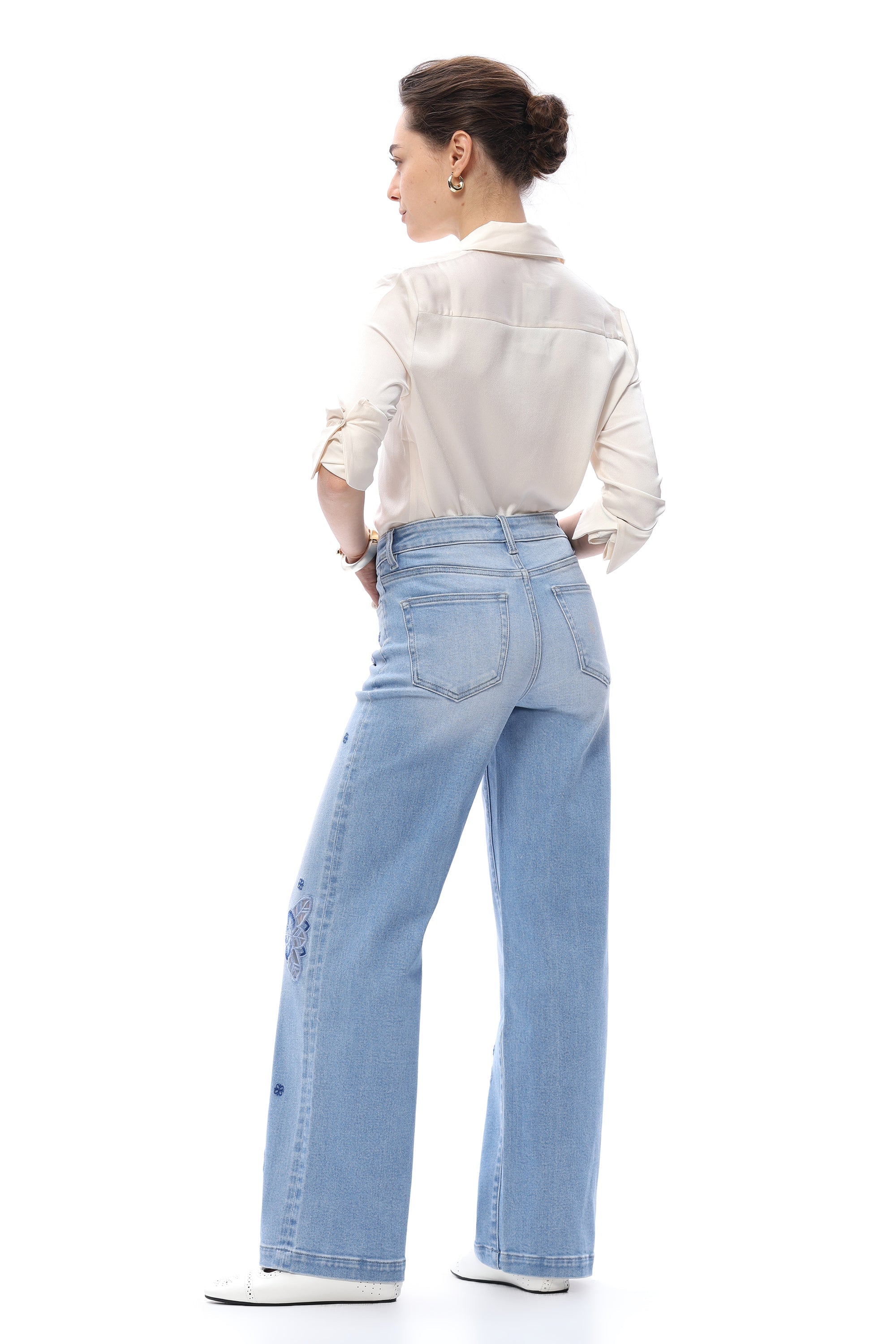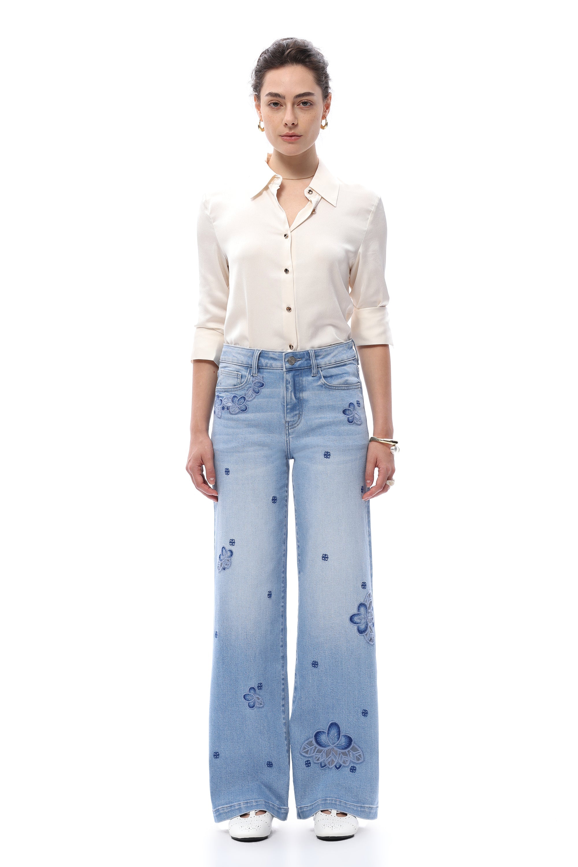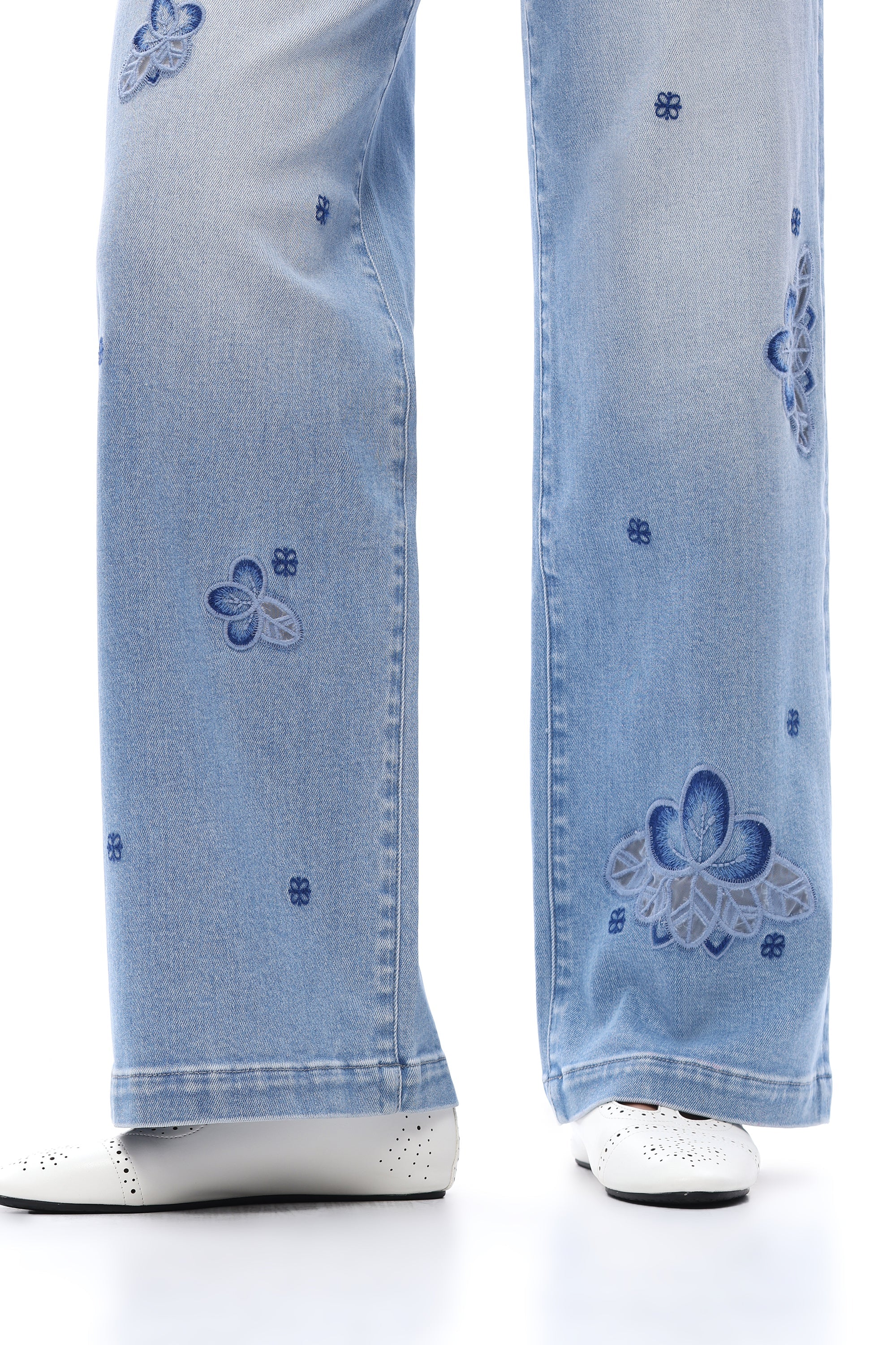 Mid-rise straight-leg jeans, embroidered style, made of high-elasticity denim fabric, with zipper closure.