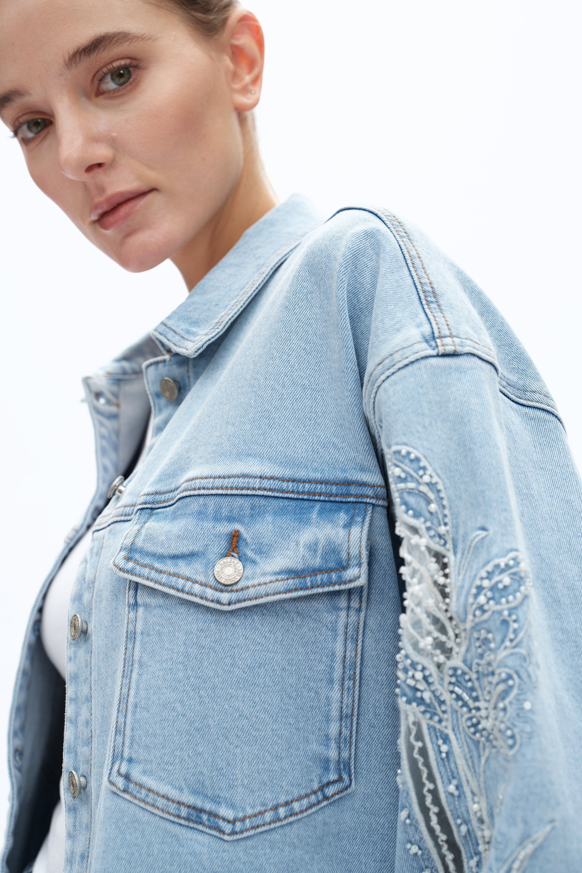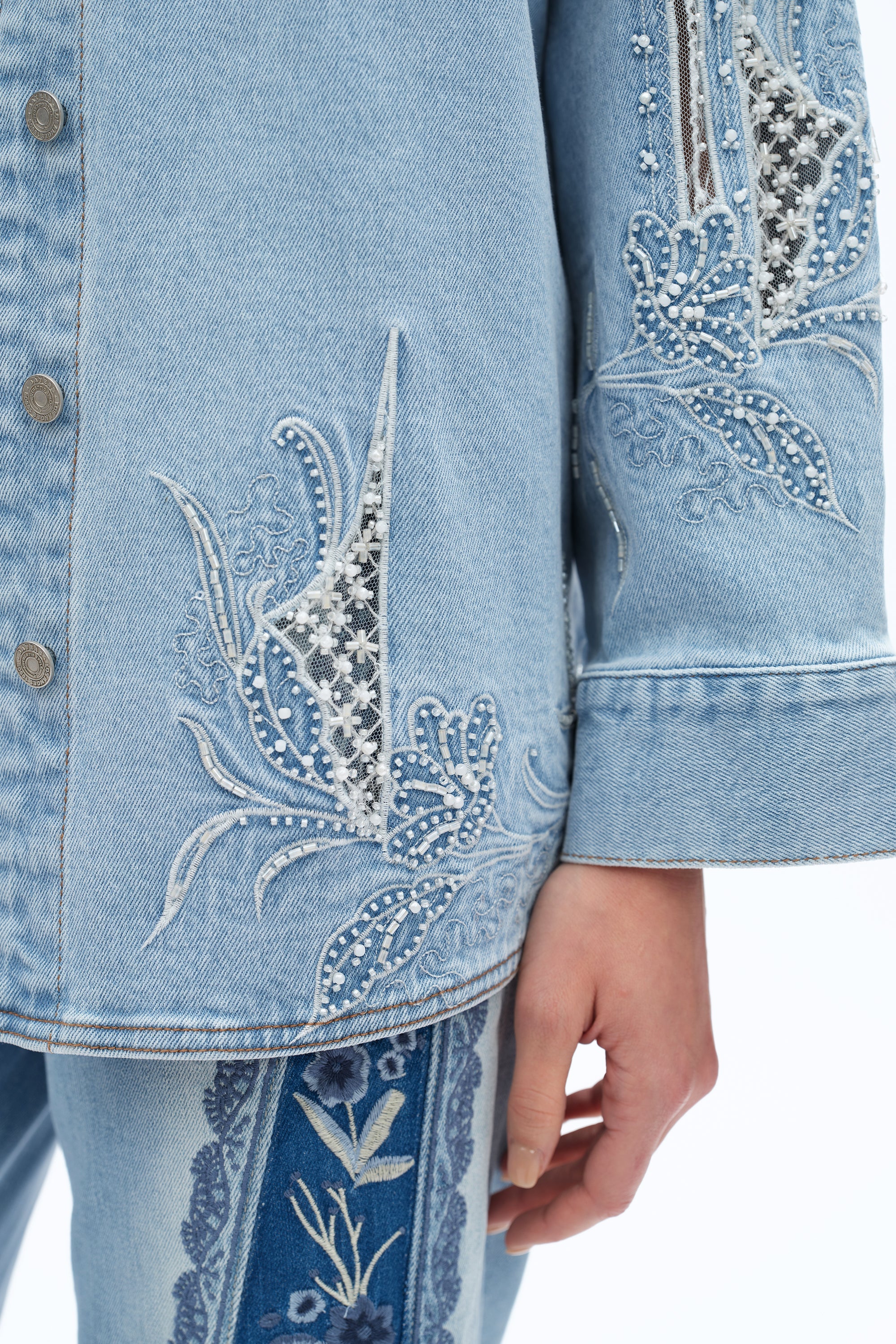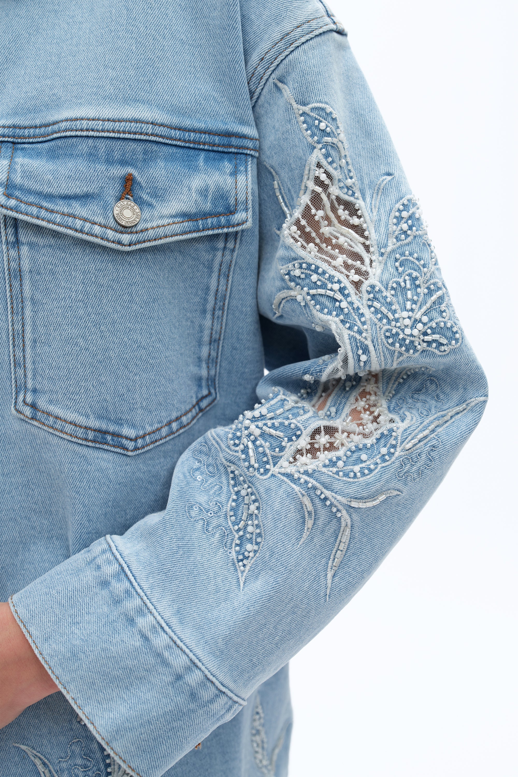 Relaxed embroidered denim jacket in a classic light blue wash, combining denim heritage with intricate embroidery. The design features cut-out embroidery paired with decorative pearl tube beads for a refined textural highlight. The loose silhouette offers a comfortable and relaxed wearing experience.