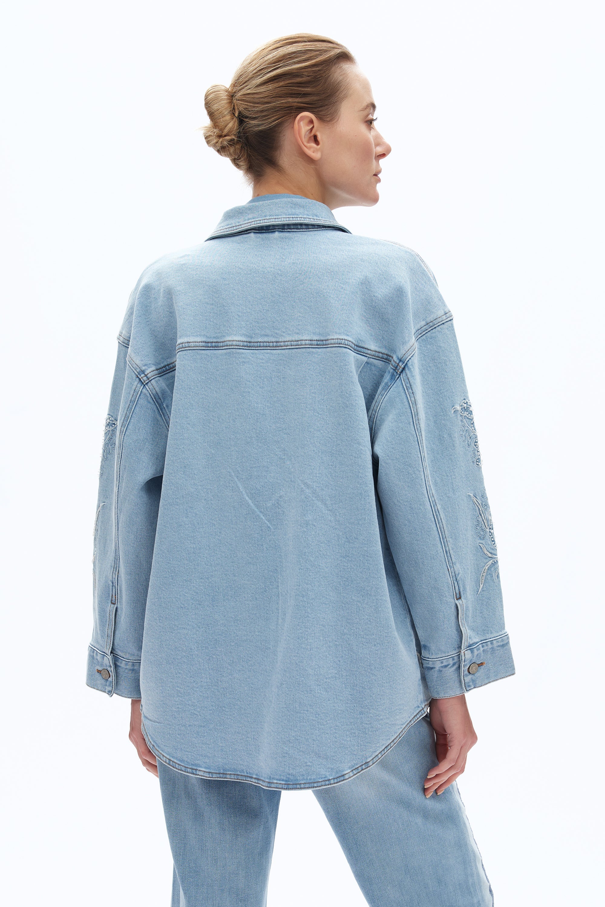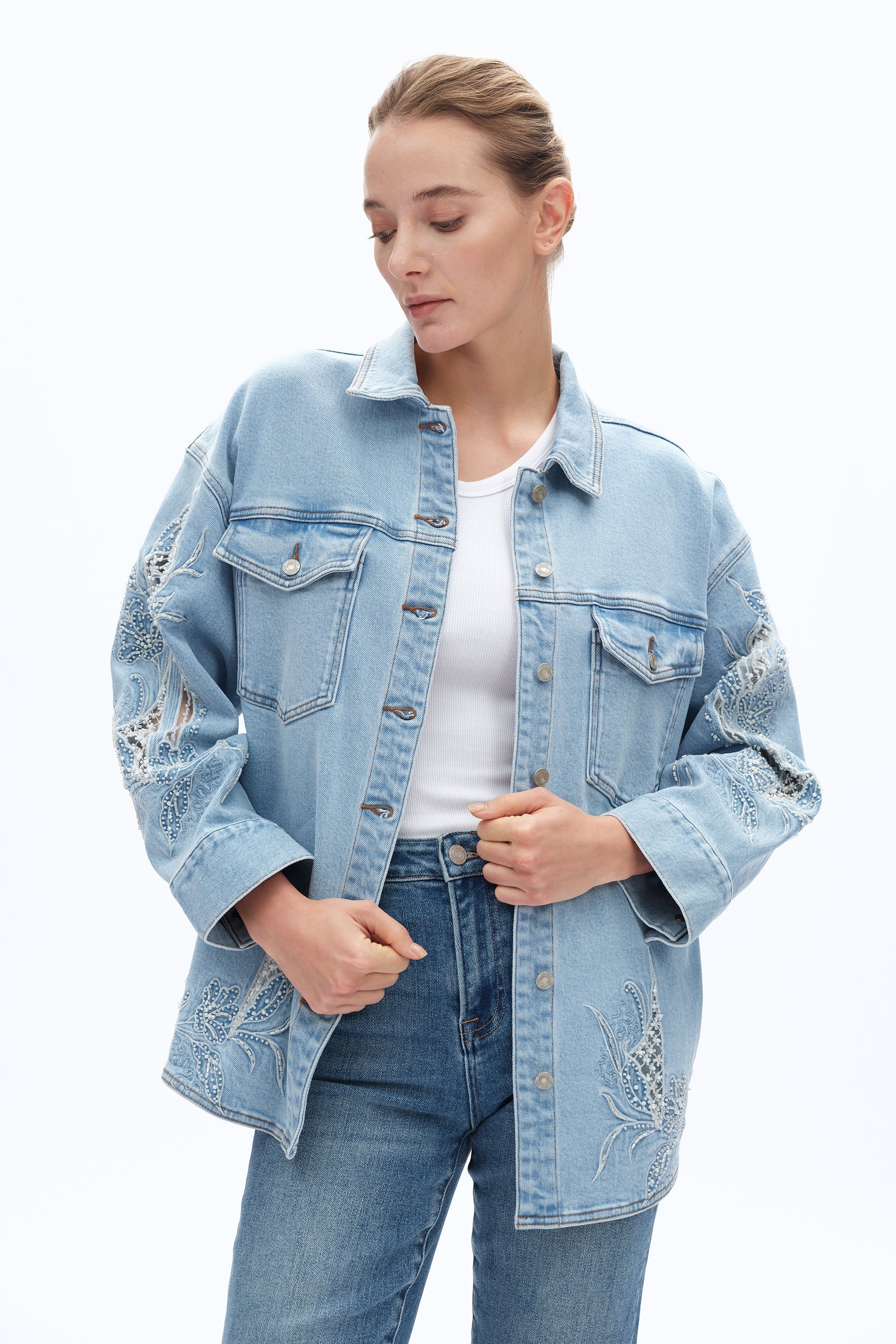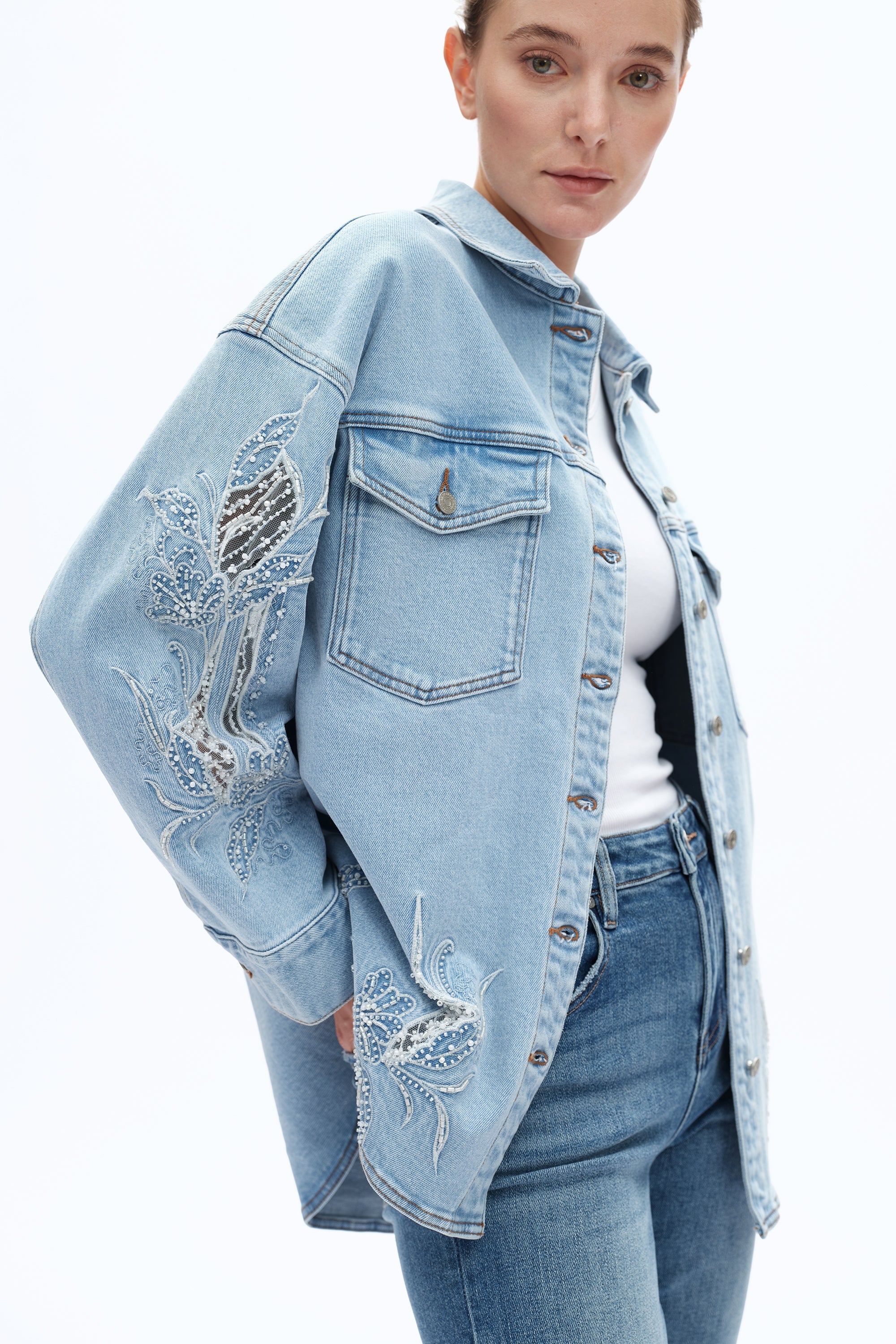 Relaxed embroidered denim jacket in a classic light blue wash, combining denim heritage with intricate embroidery. The design features cut-out embroidery paired with decorative pearl tube beads for a refined textural highlight. The loose silhouette offers a comfortable and relaxed wearing experience.