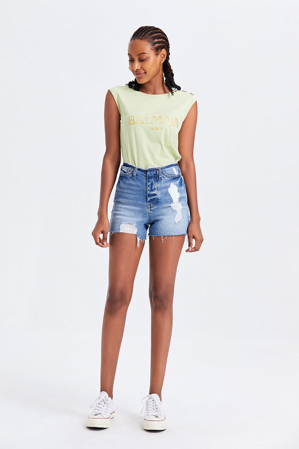 These high-rise denim shorts feature a minimalist bandless waistband. They are finished with stylish distressing and a raw hem for a laid-back look.
