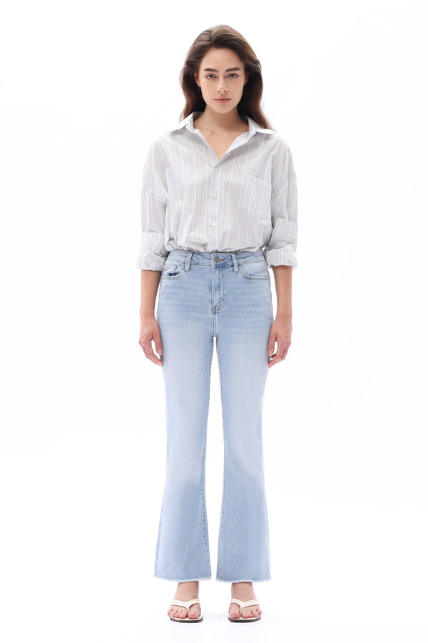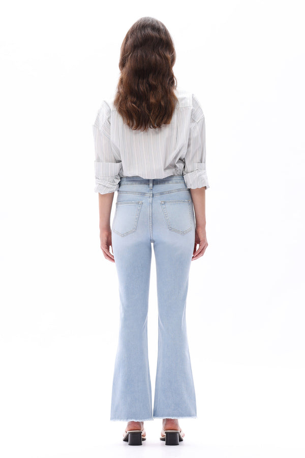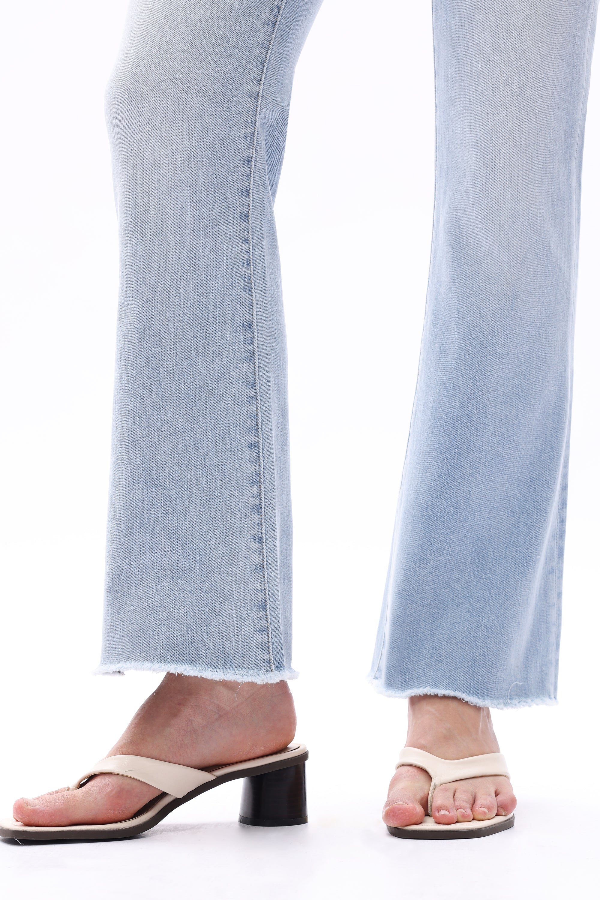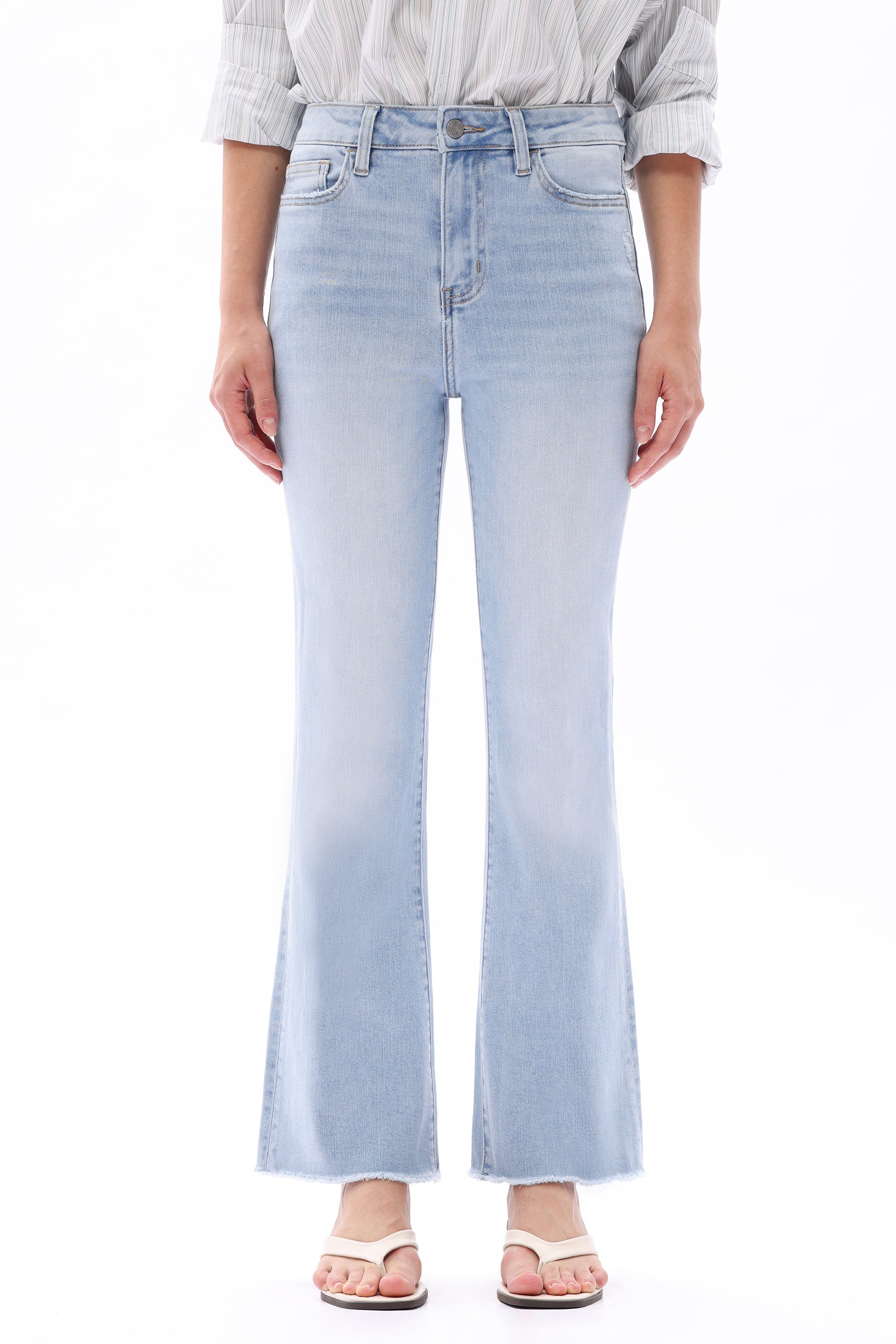Crafted from comfortable stretch denim, these high-rise flare jeans feature a flattering bootcut silhouette and a modern raw hem for effortless style.