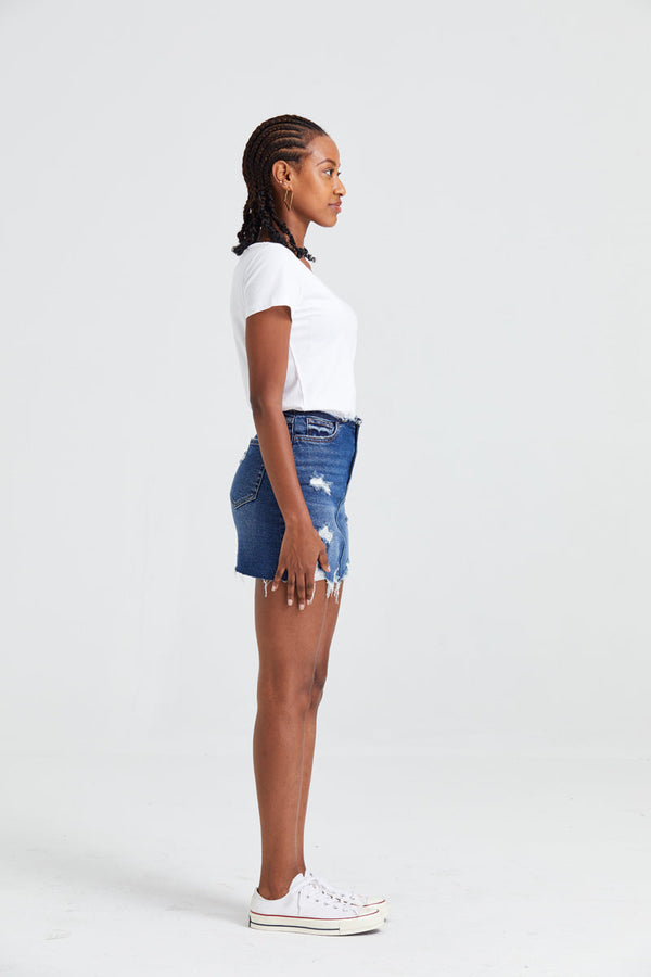 Achieve an effortlessly cool vibe with this high-rise distressed denim skirt. A vintage-inspired wash and bold frayed hem make it a versatile staple.