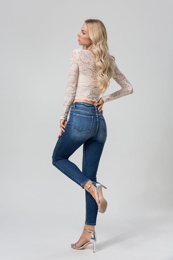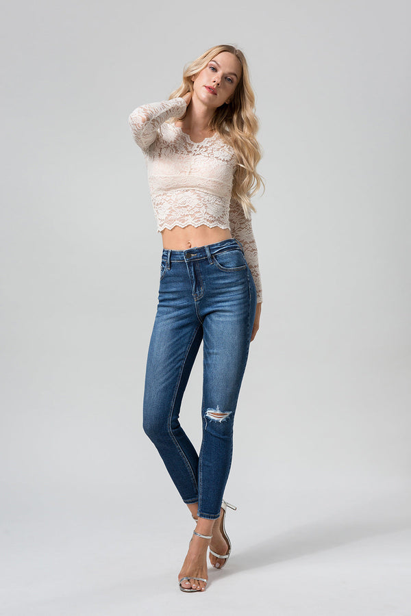 High Rise Straight Leg Jeans featuring an authentic blue wash, distinct whiskering, and fading. Designed with knee distressing and a finished cropped hem.