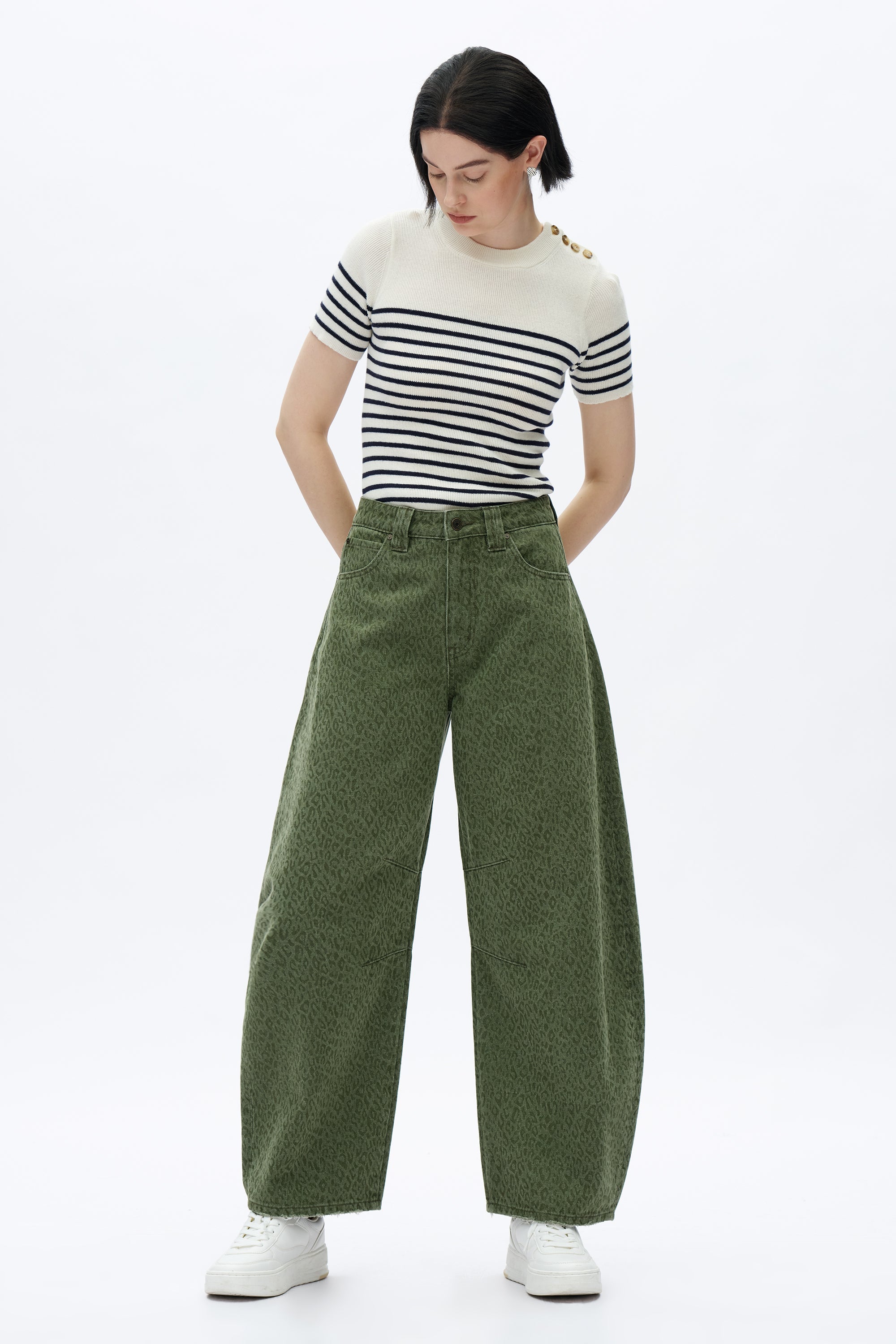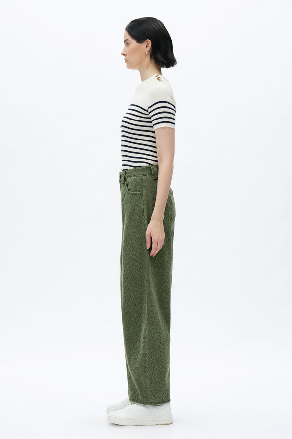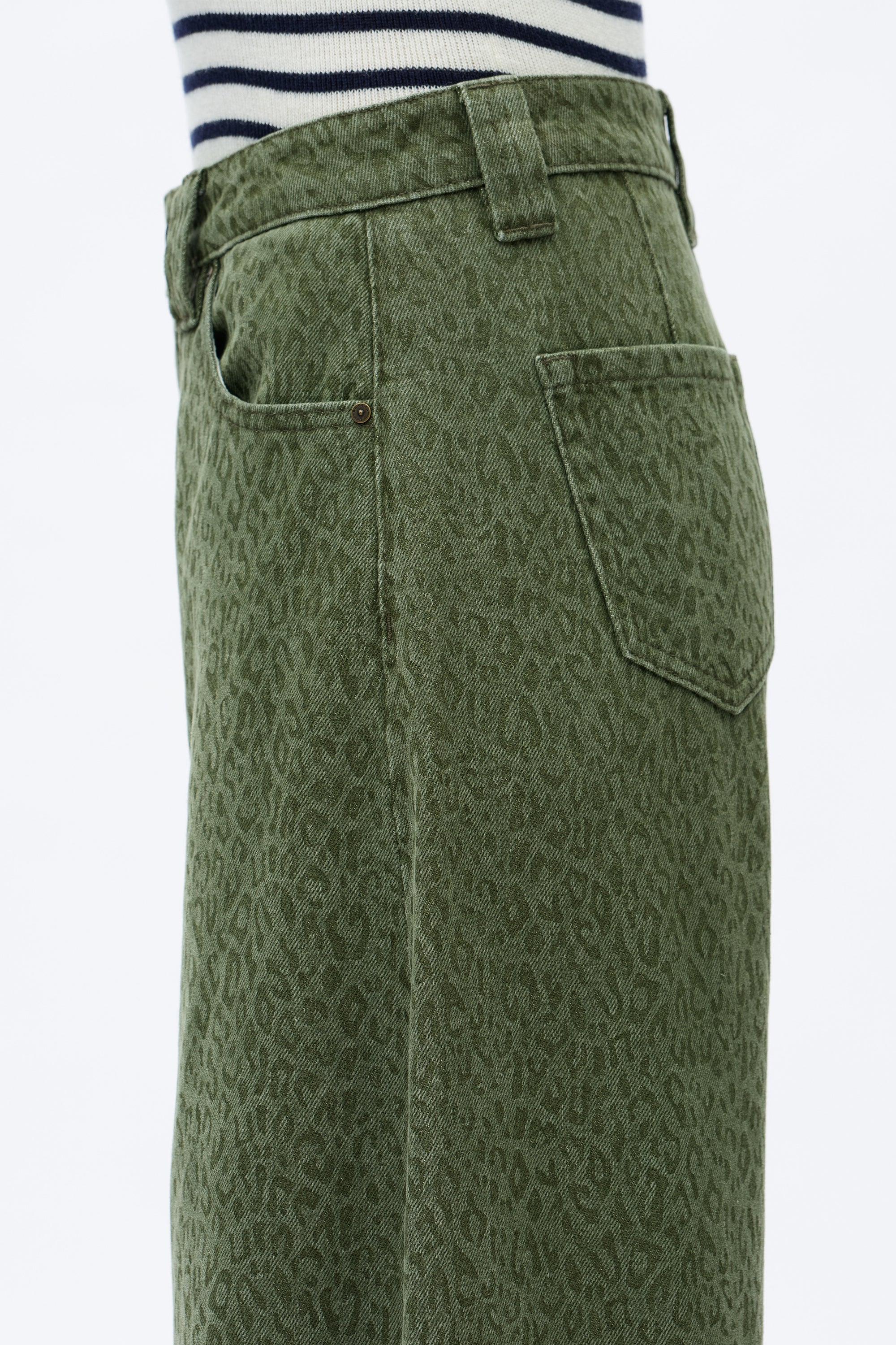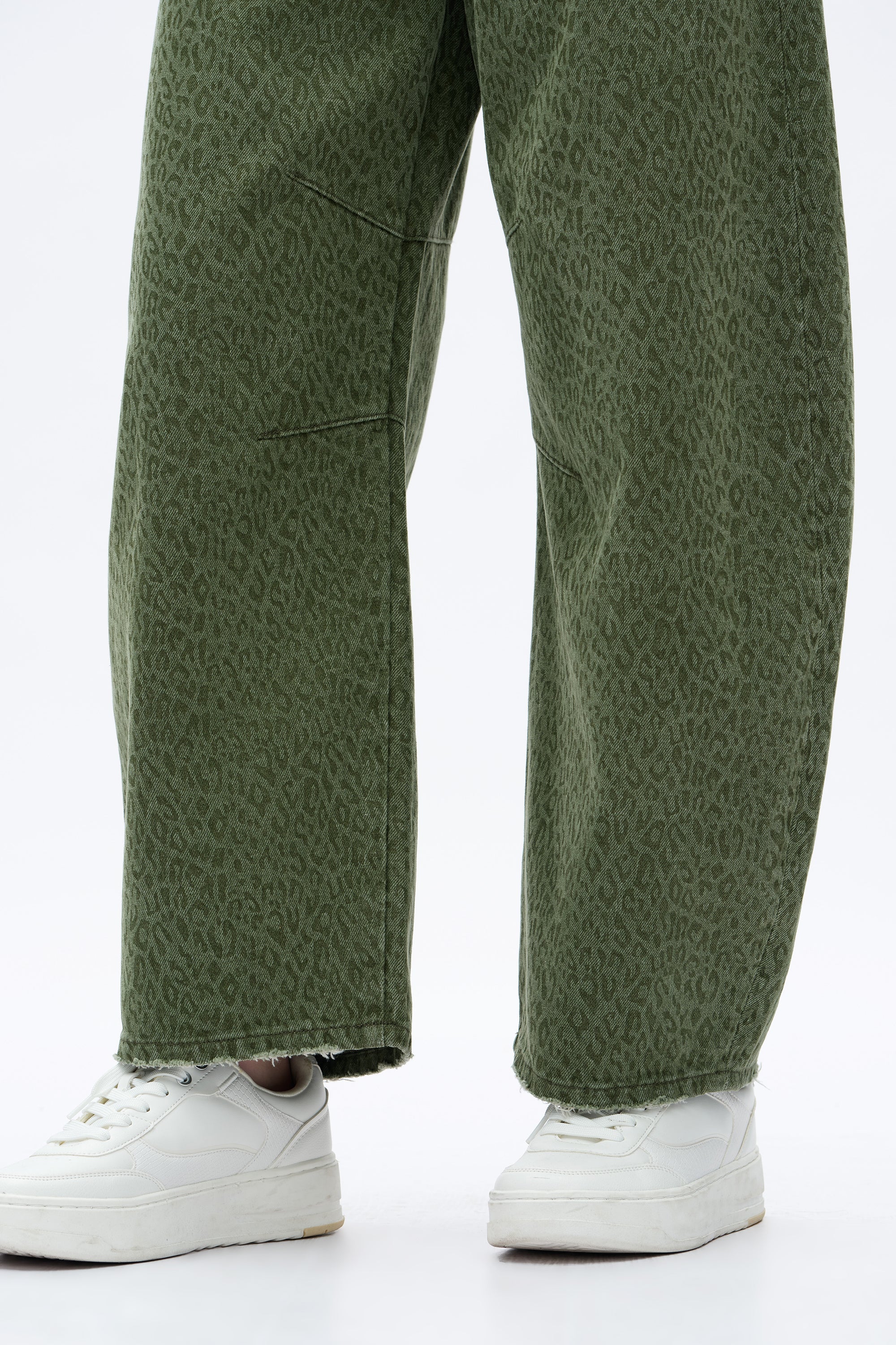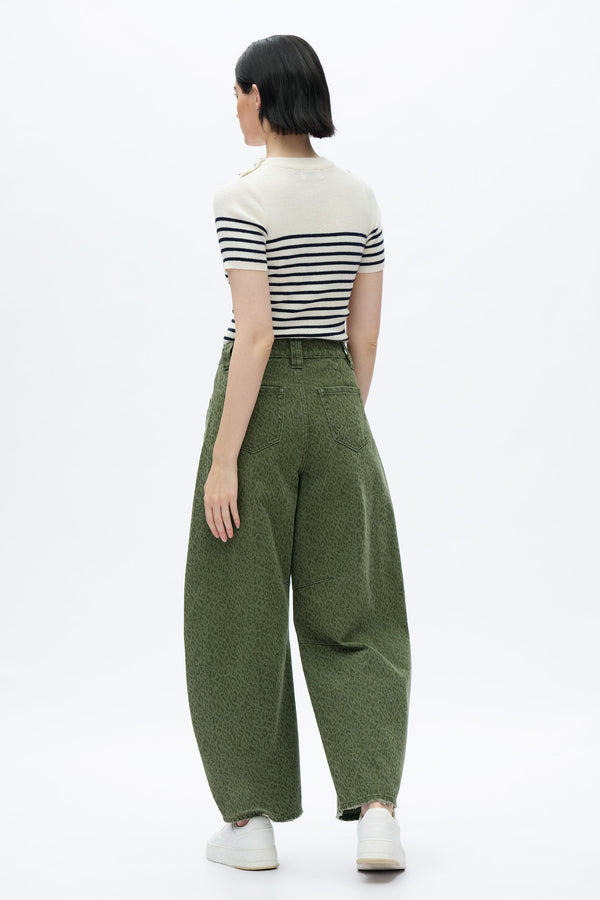 With a comfortable high-rise and a relaxed, drop crotch fit. The jeans have a curved, voluminous leg and are made from a green denim with a subtle leopard-like print.
