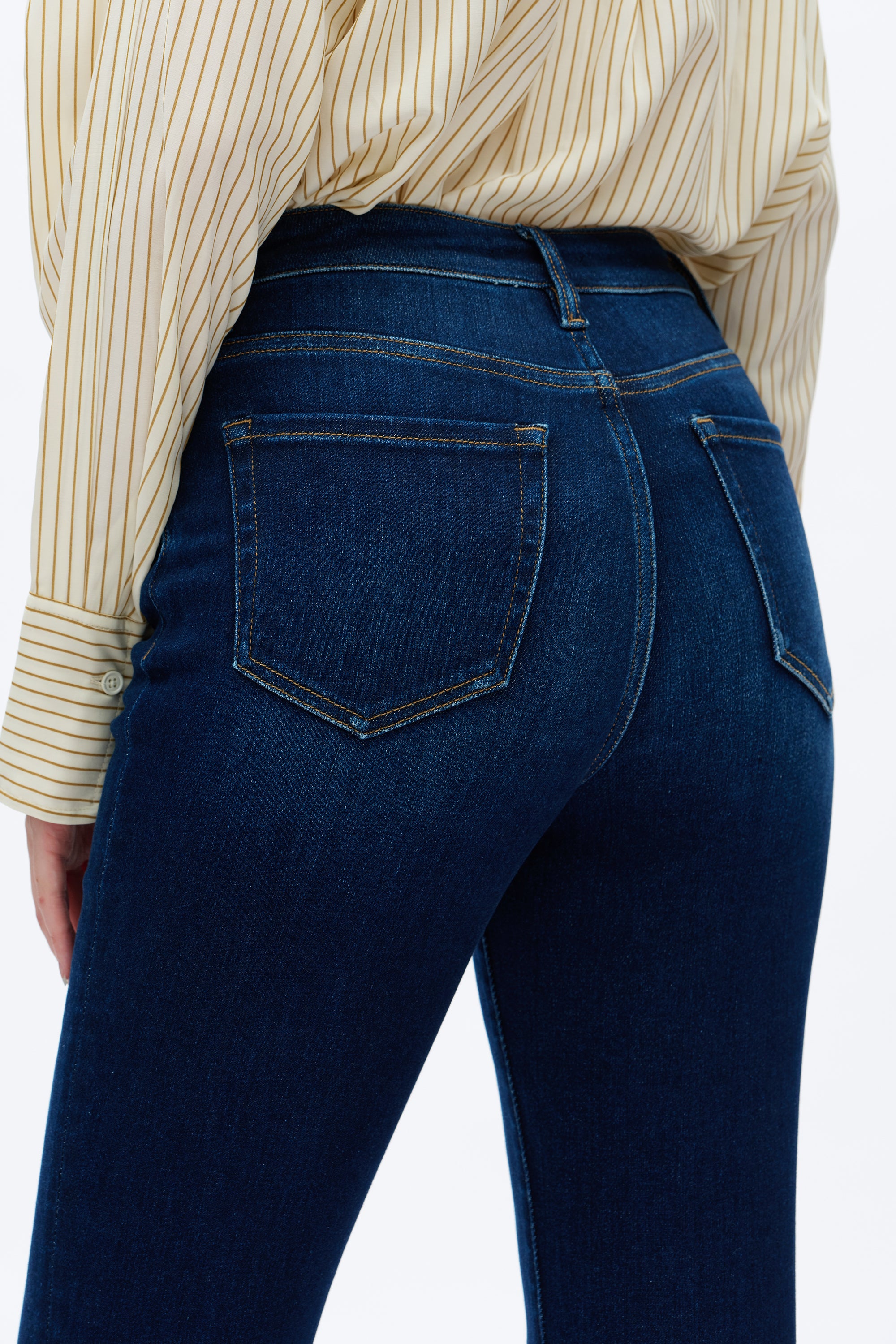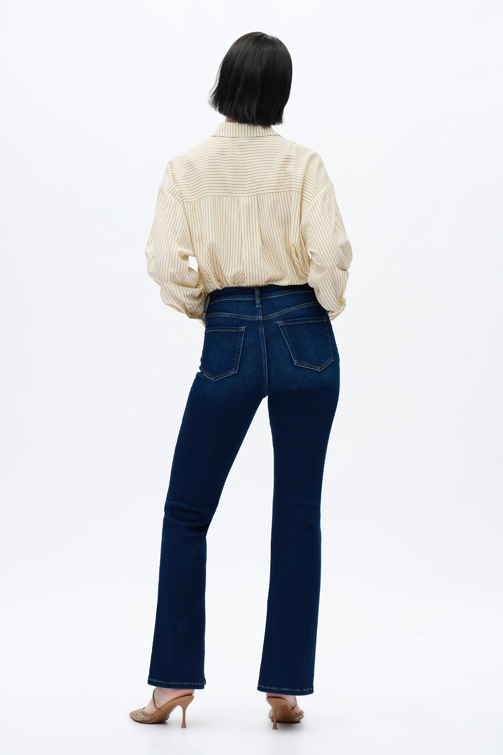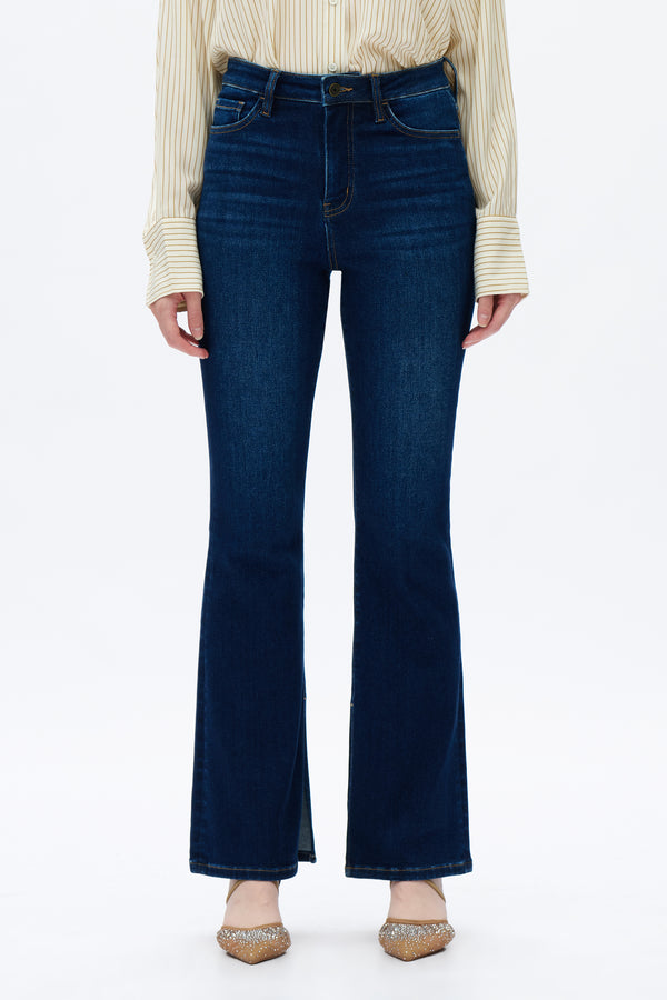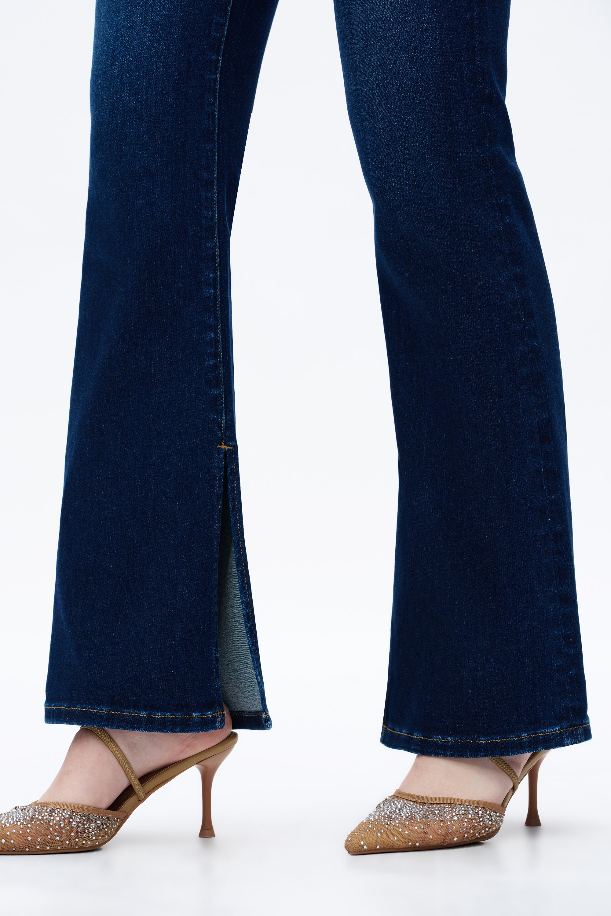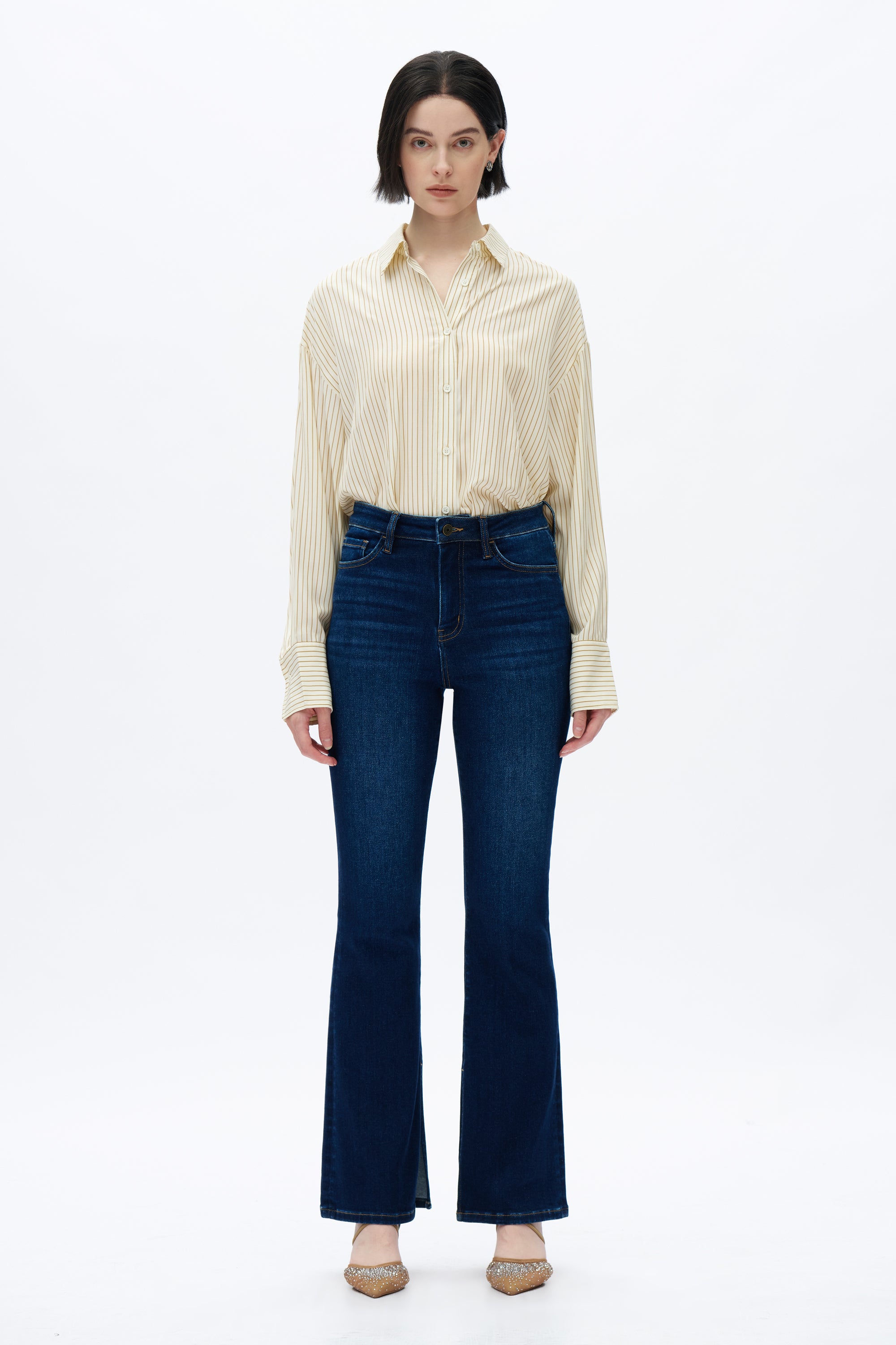 Light-wash denim designed with a flattering flare leg and side slits, adding modern detail and comfort for versatile everyday styling.