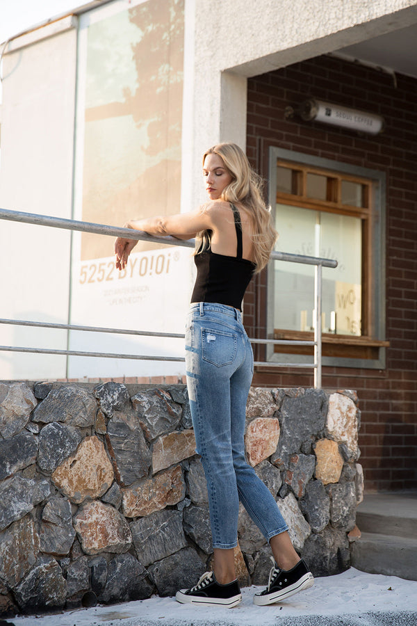 Effortlessly cool and comfortable. These high-rise Mom jeans feature a relaxed, slightly tapered leg and fashionable distressed knees, providing a versatile look for any day of the week.