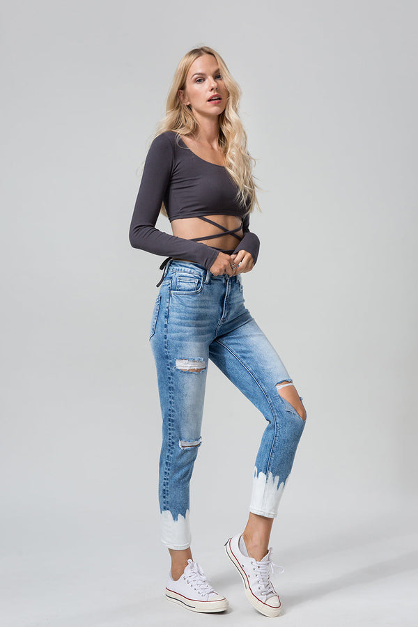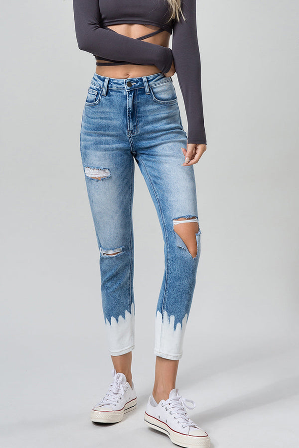 Make a statement with our high-rise Mom jeans. The comfortable high waist, relaxed fit, and striking white dip-dye design provide a unique and eye-catching addition to your casual wardrobe.