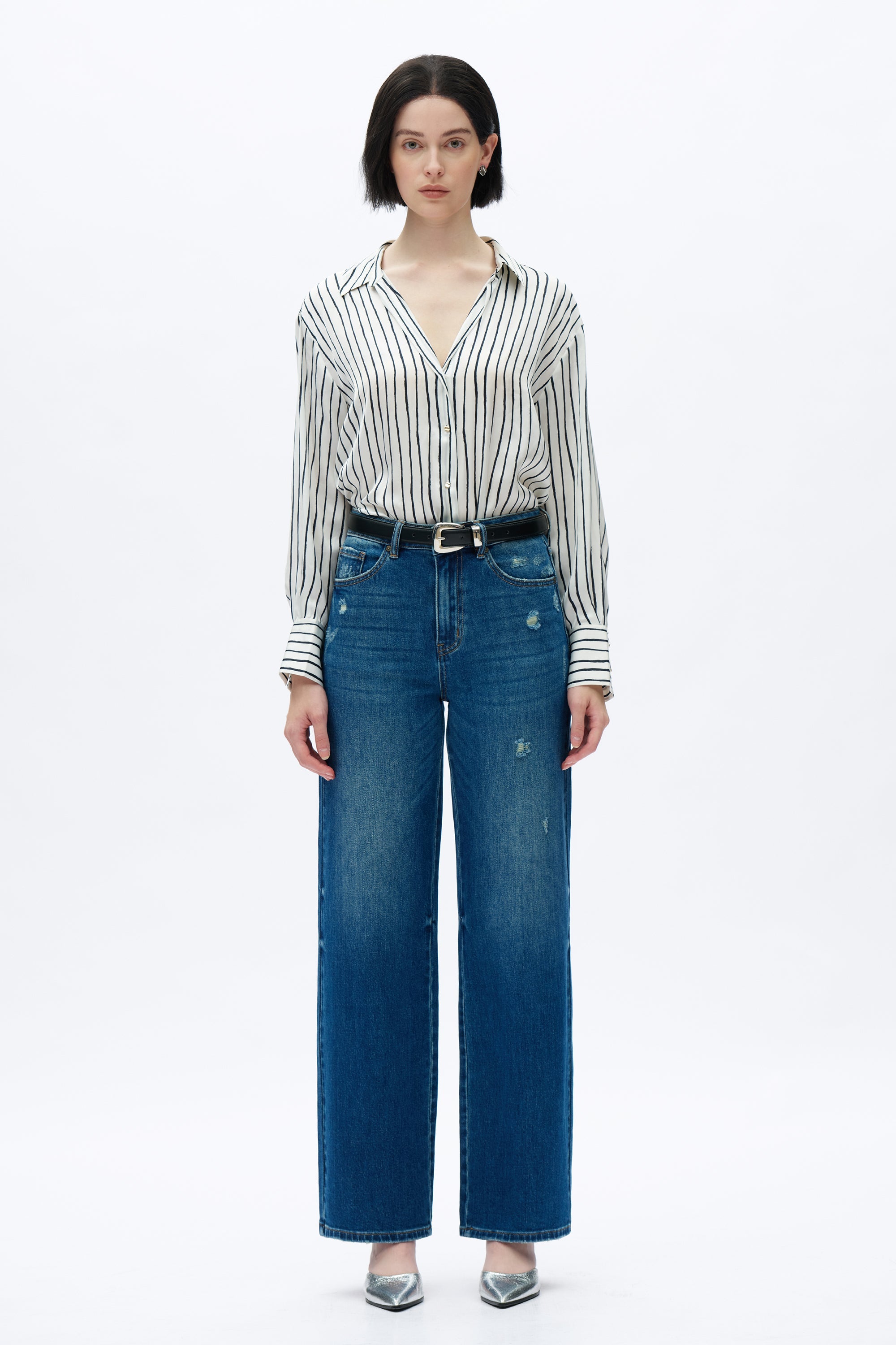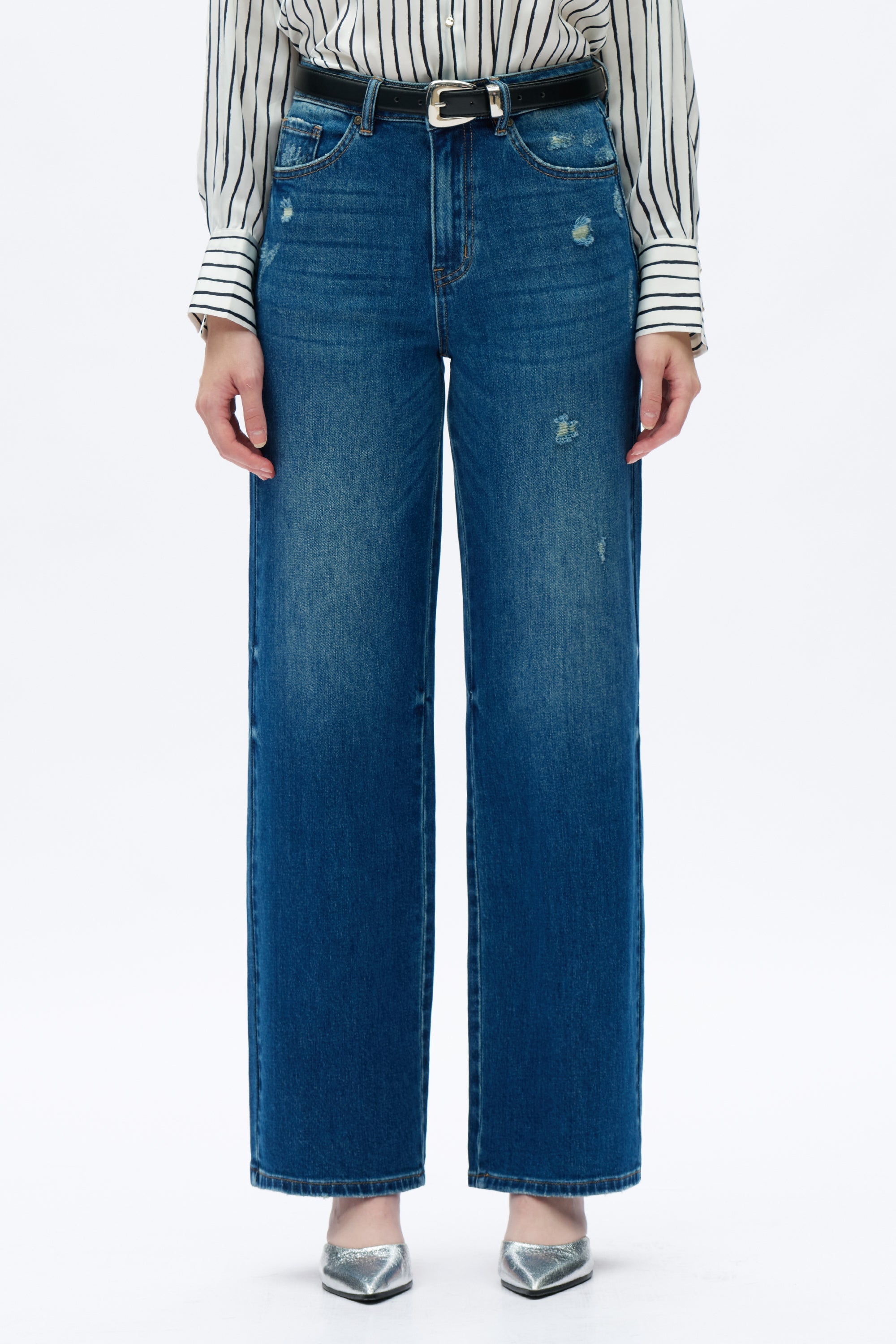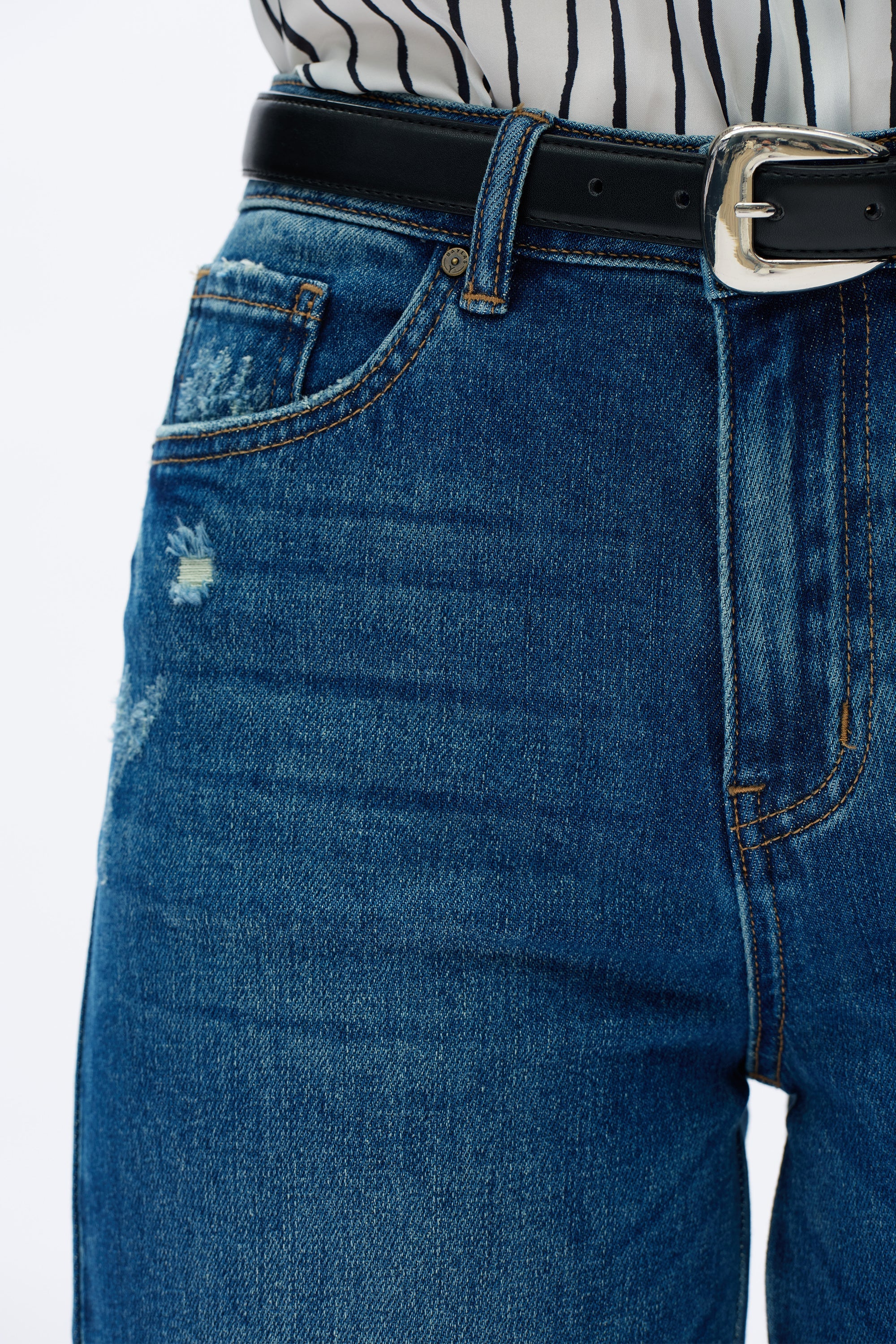 High rise relaxed straight jeans with five pockets in a vintage medium blue with slight stretch and hand-worn details in areas with distressed pockets.