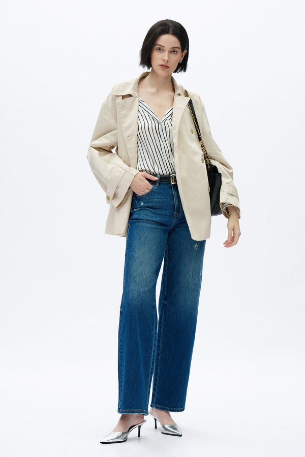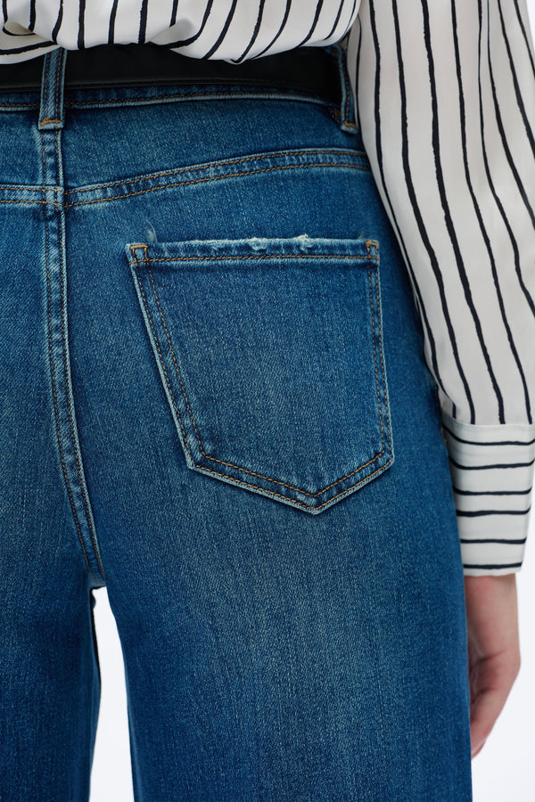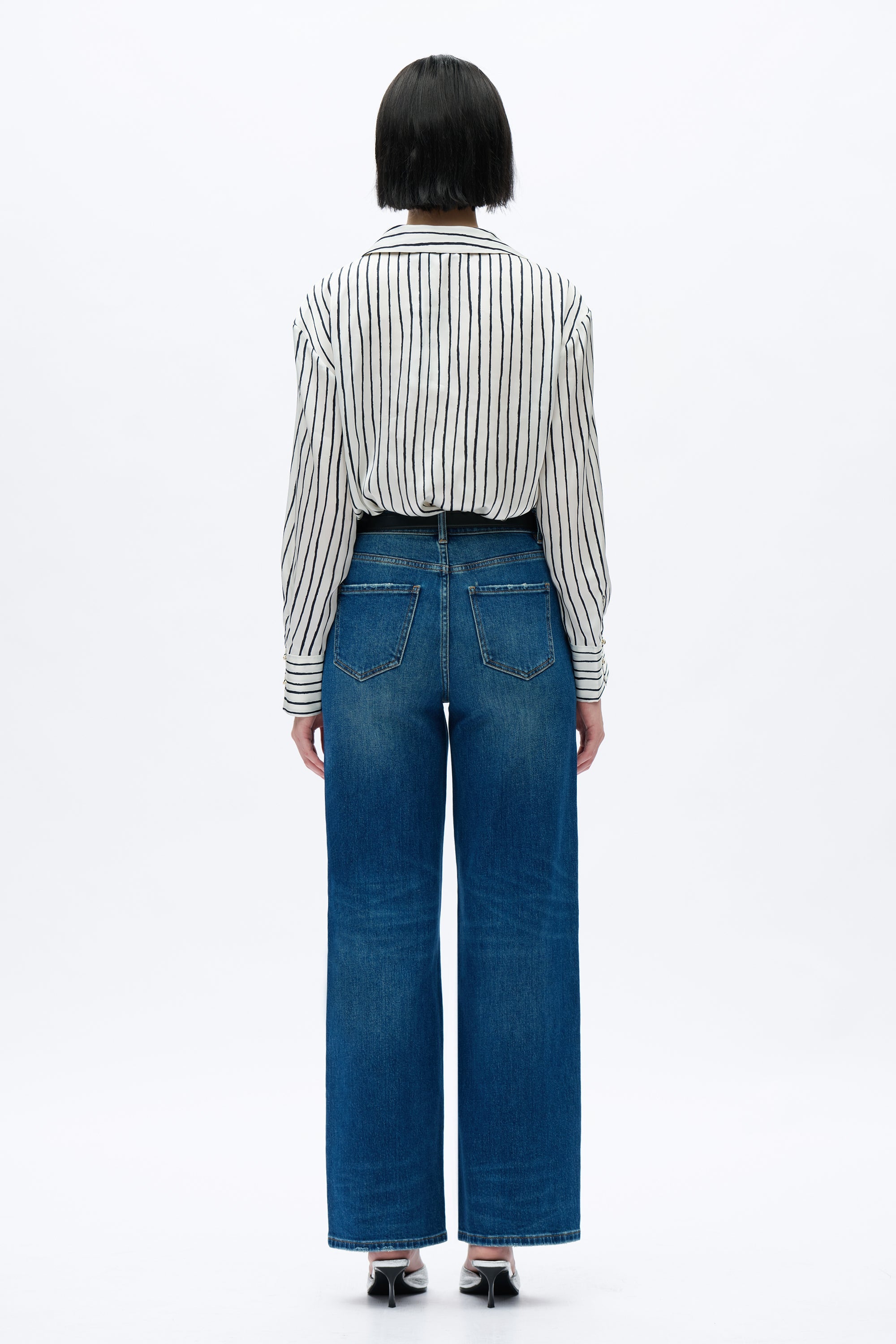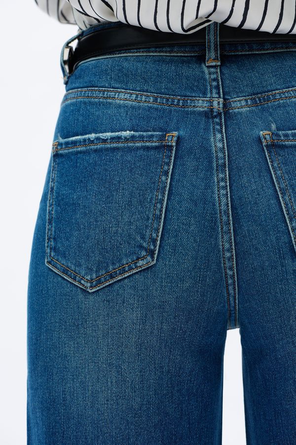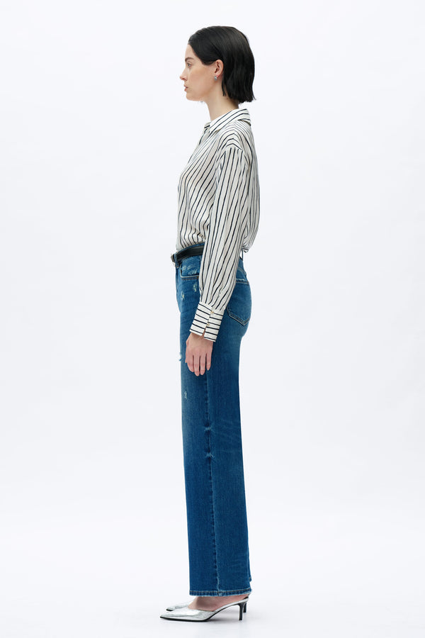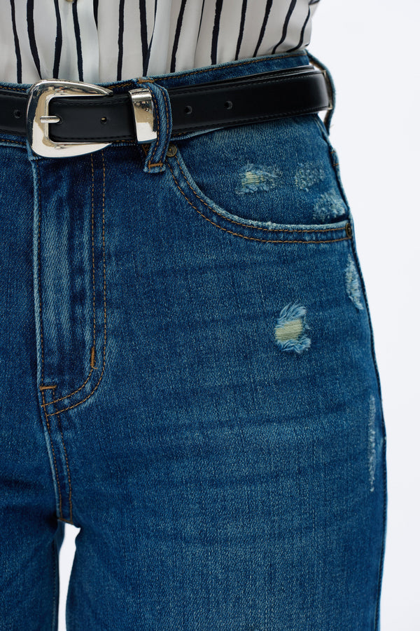 High rise relaxed straight jeans with five pockets in a vintage medium blue with slight stretch and hand-worn details in areas with distressed pockets.