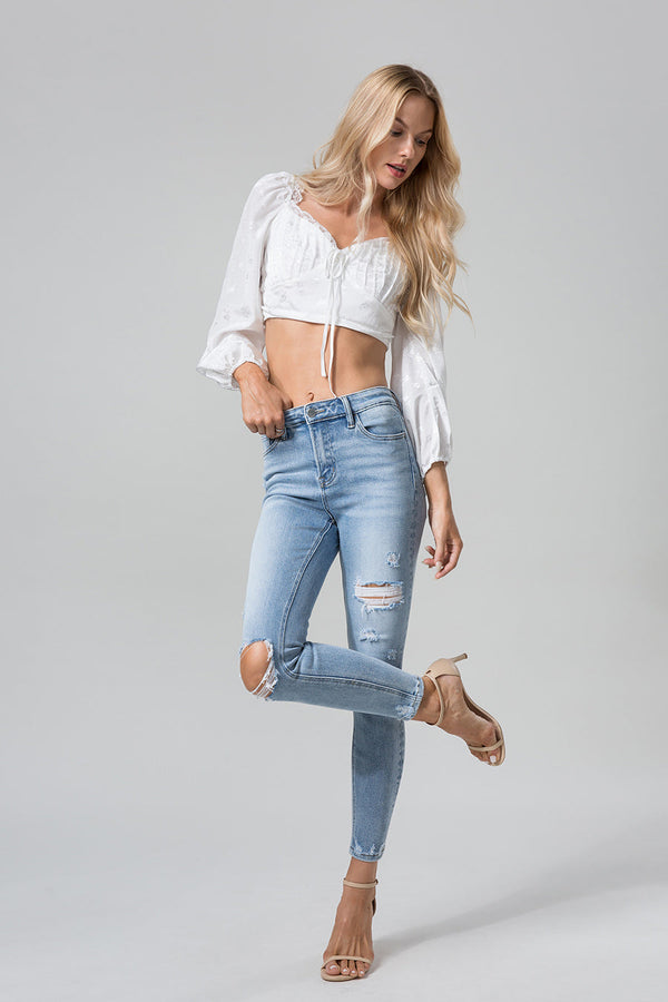 High rise skinny jeans with a slim leg and cropped cut. Features a light blue denim wash and prominent distressing with open tears on the knees.