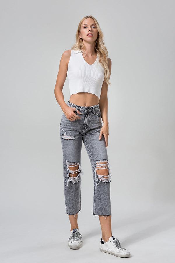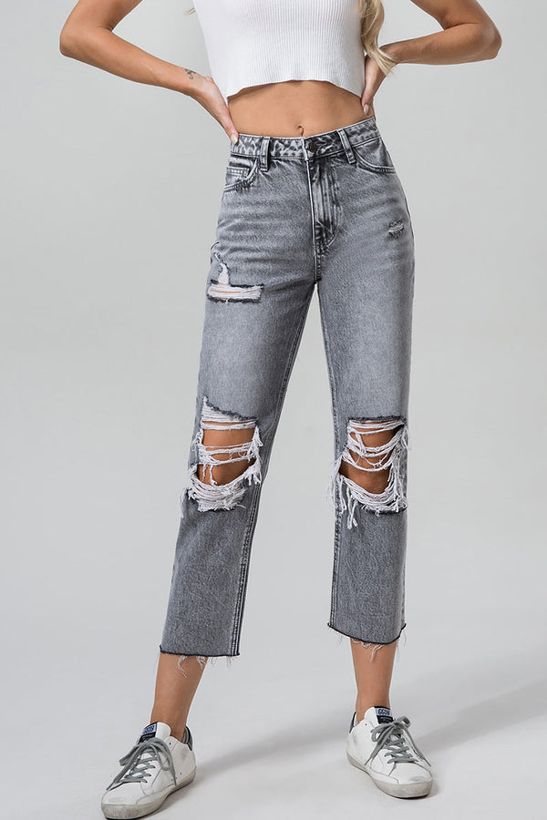 Vintage gray wash High Rise Straight Leg Jeans. Edgy distressing & a raw hem create an effortlessly cool look. Find your fit today!