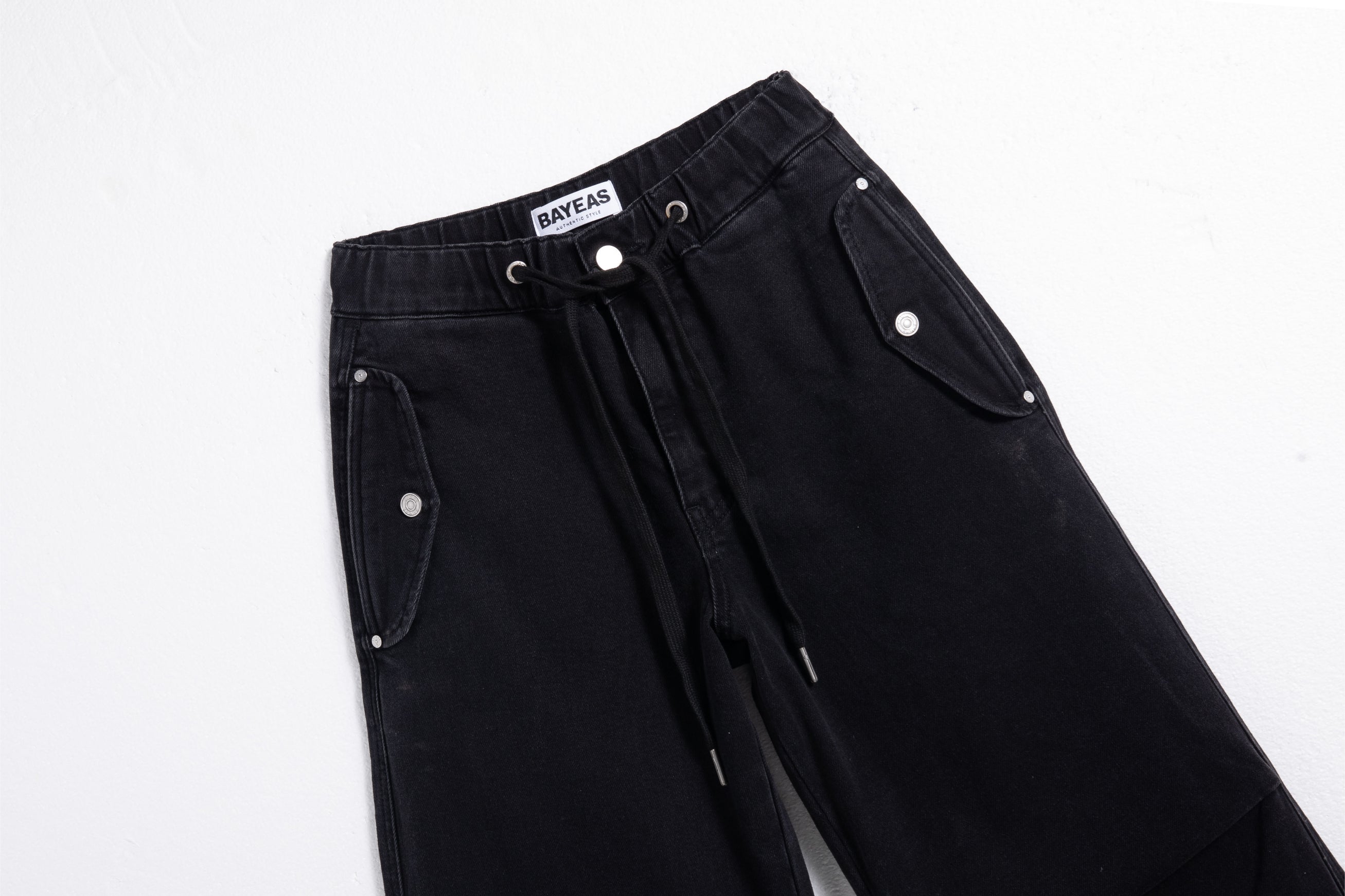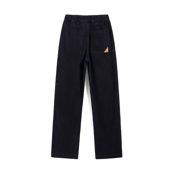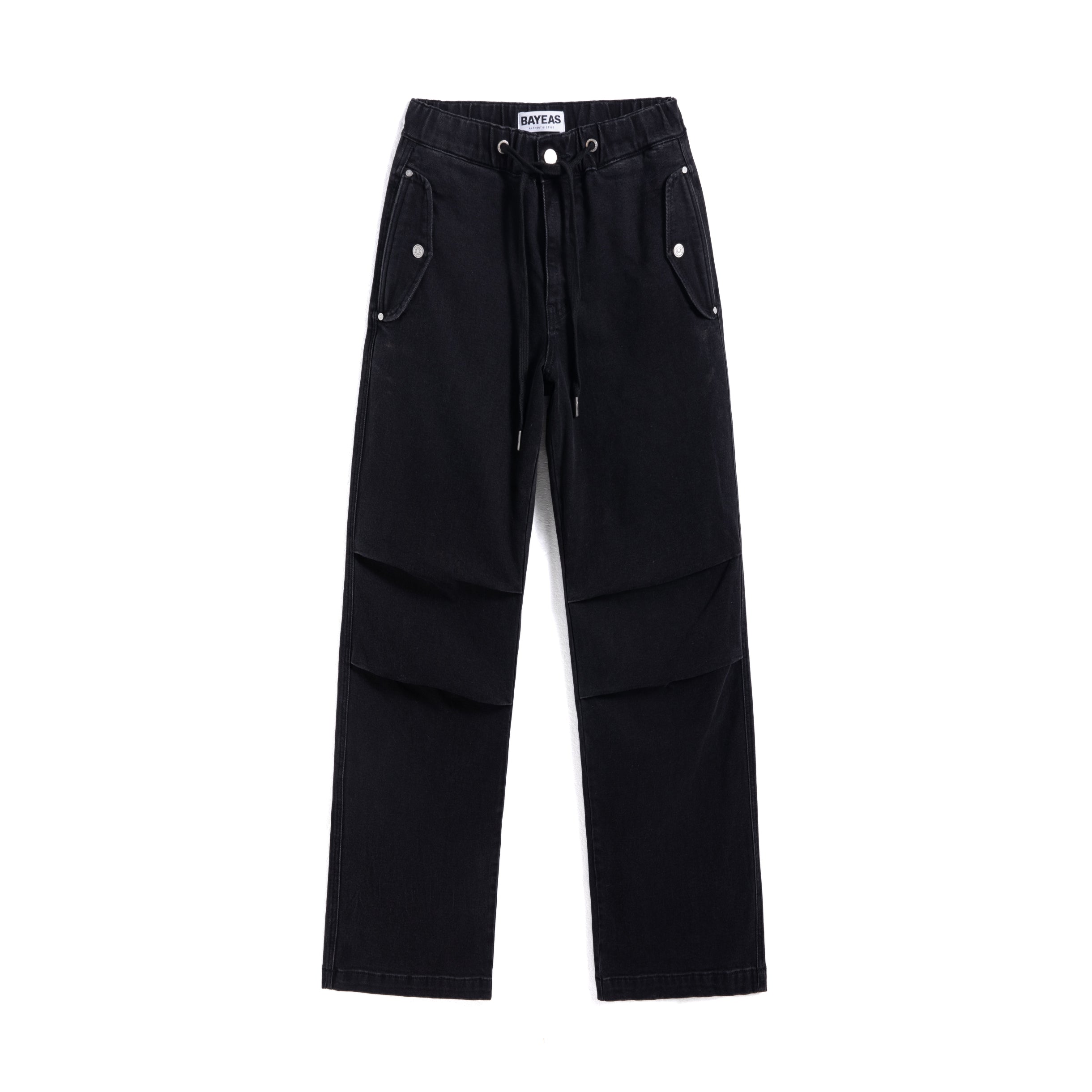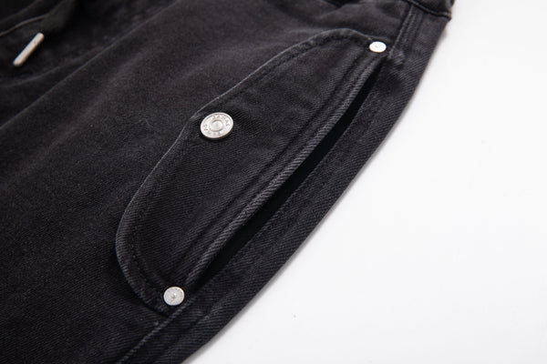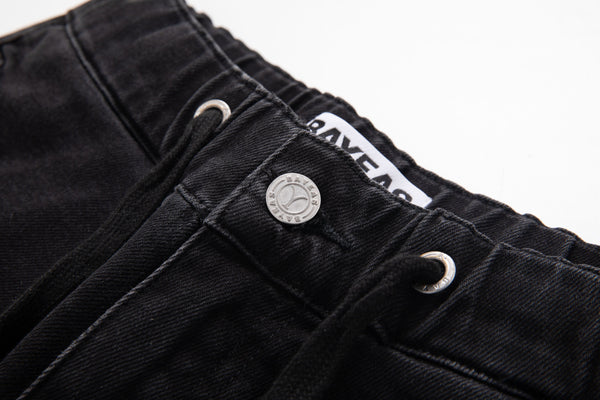High-rise drawstring wide-leg jeans with double overlapping front pockets, elasticated and adjustable drawstring waist and pleated knees. Gray black wash, stretch fabric.