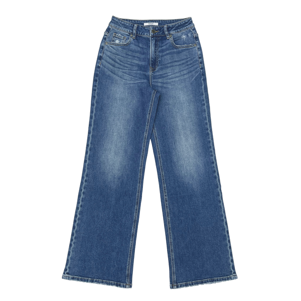 High rise wide leg jeans with a five-pocket design, medium stretch, vintage style, and a retro medium blue wash.