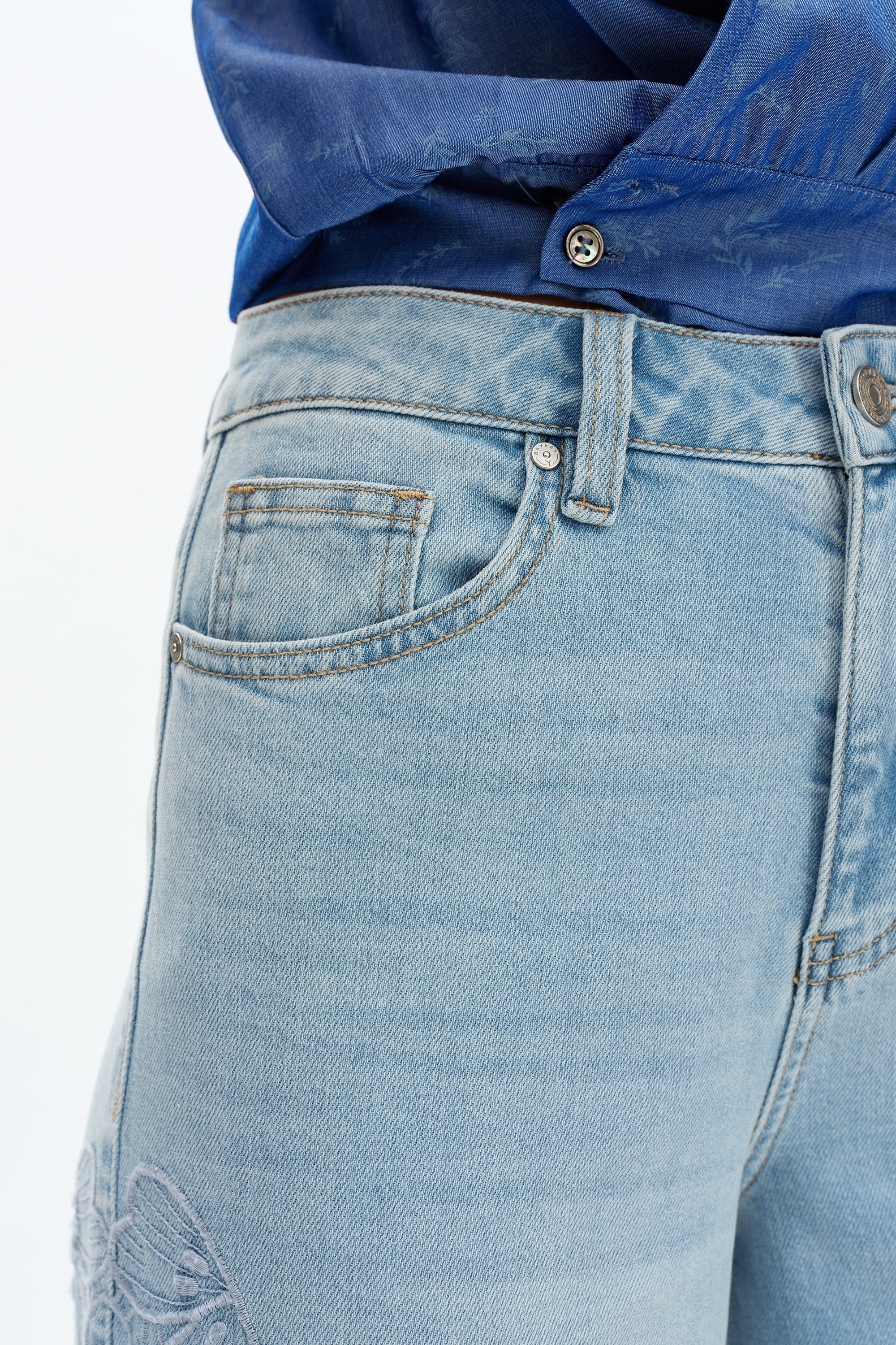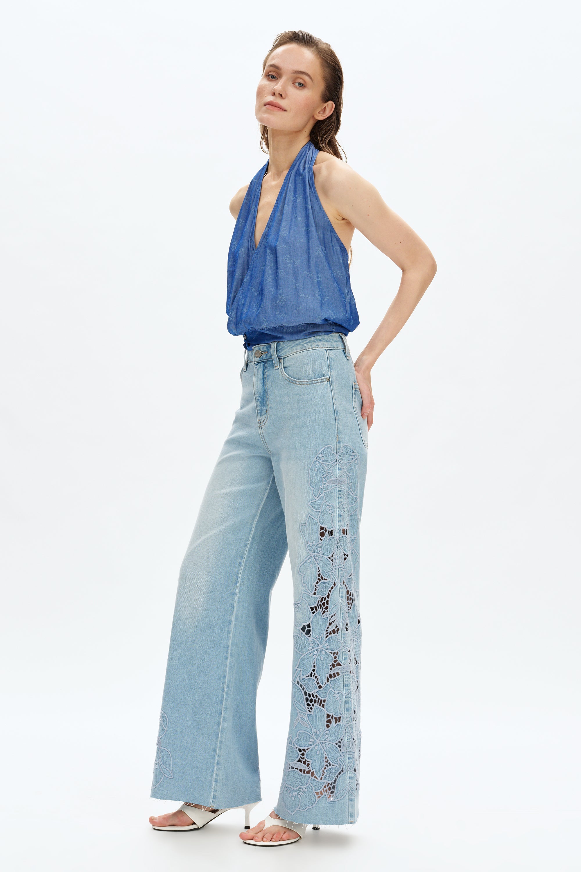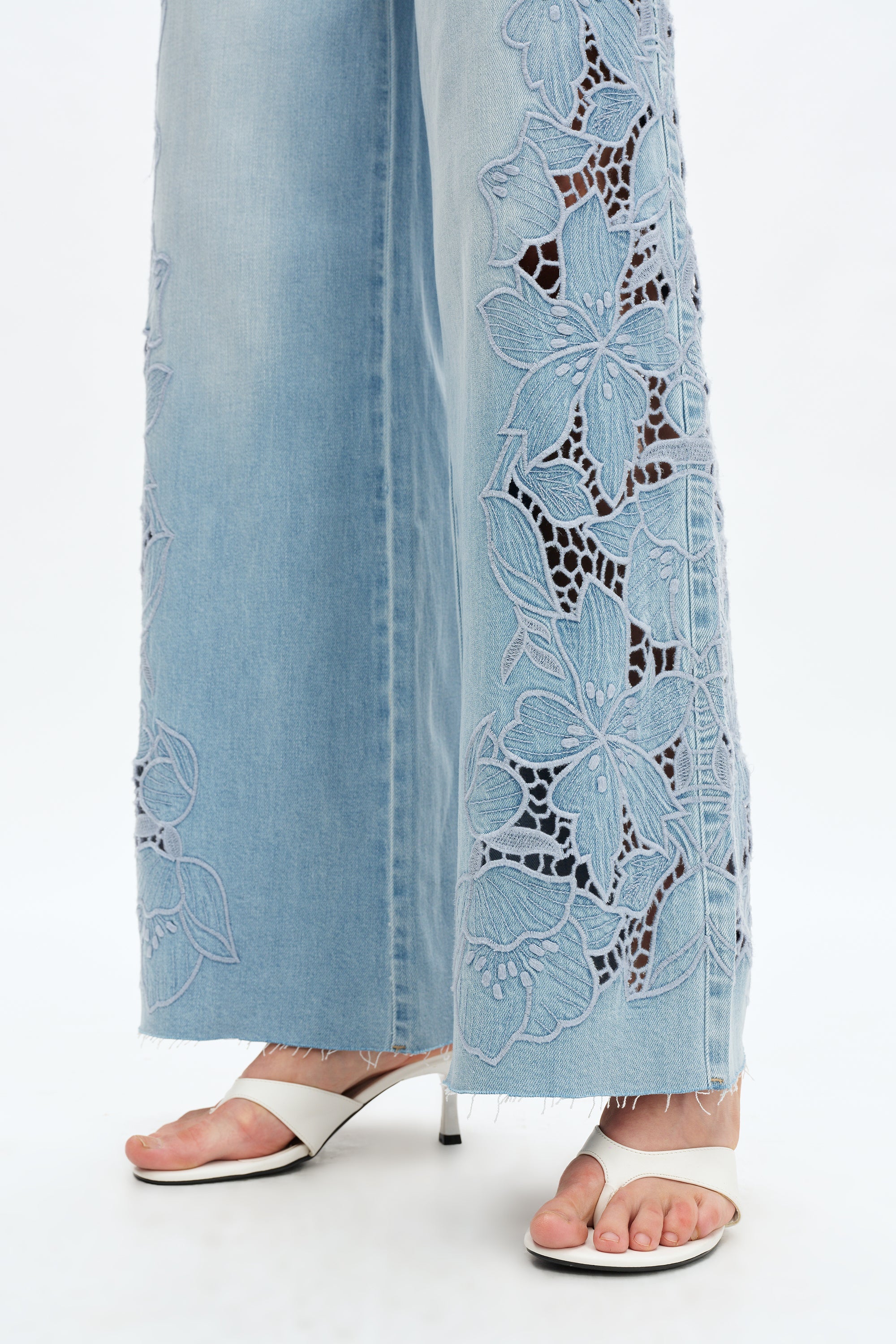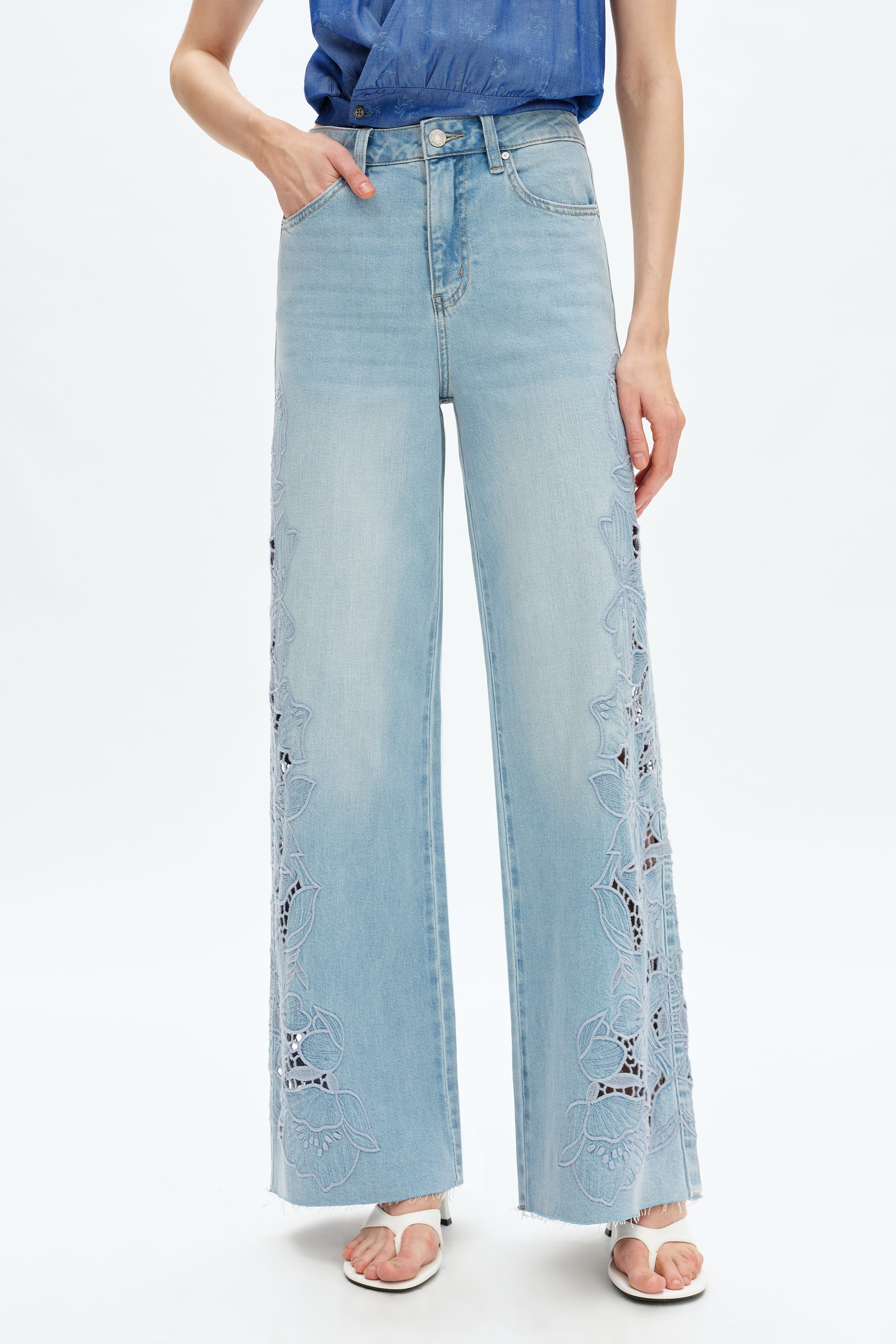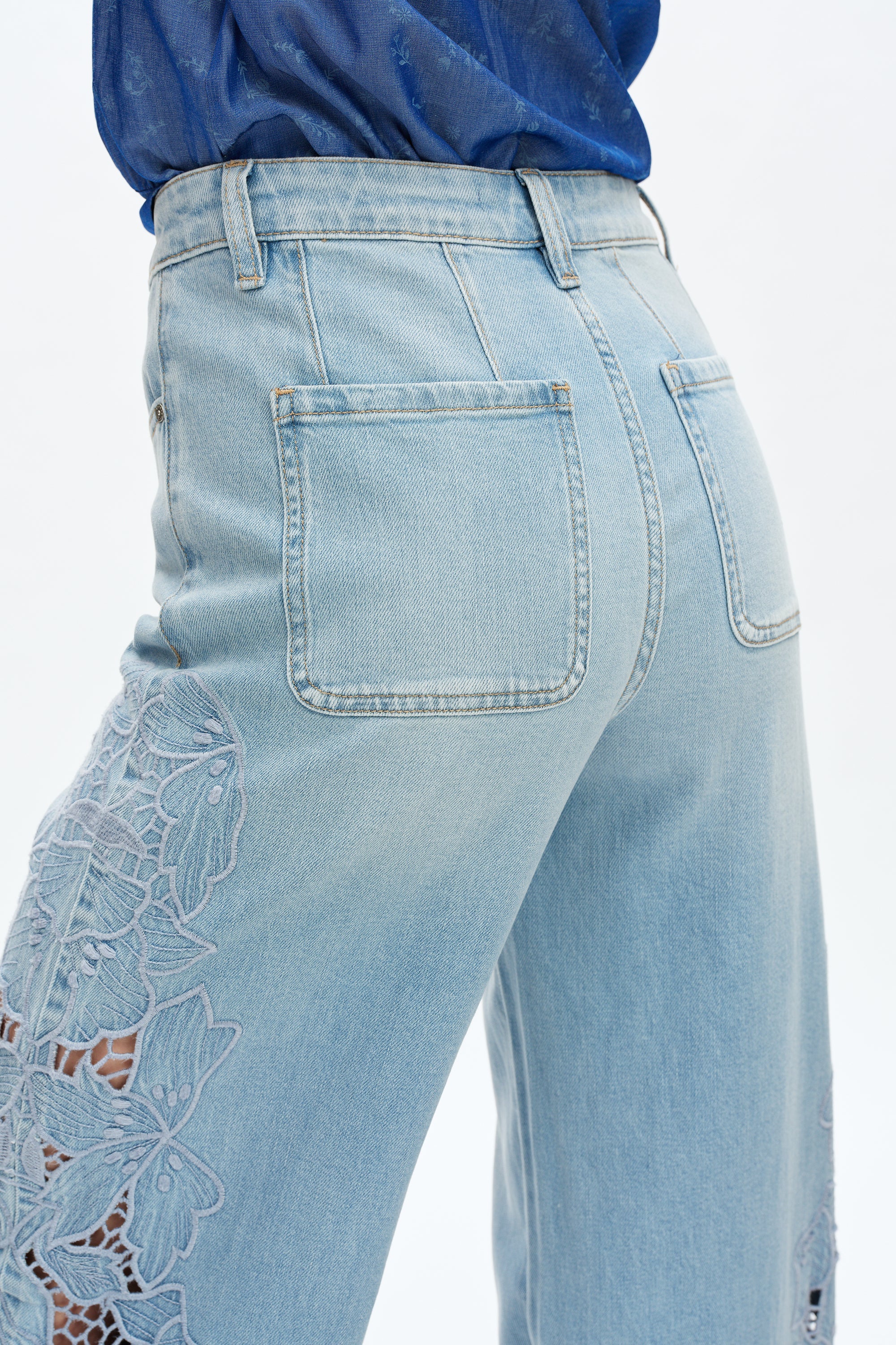 High rise wide leg jeans featuring curved square back pockets and back pleats in place of a yoke. The off-white base is accented with cutout embroidery along the side seams and hem, crafted from high-stretch fabric for a comfortable, body-contouring fit.