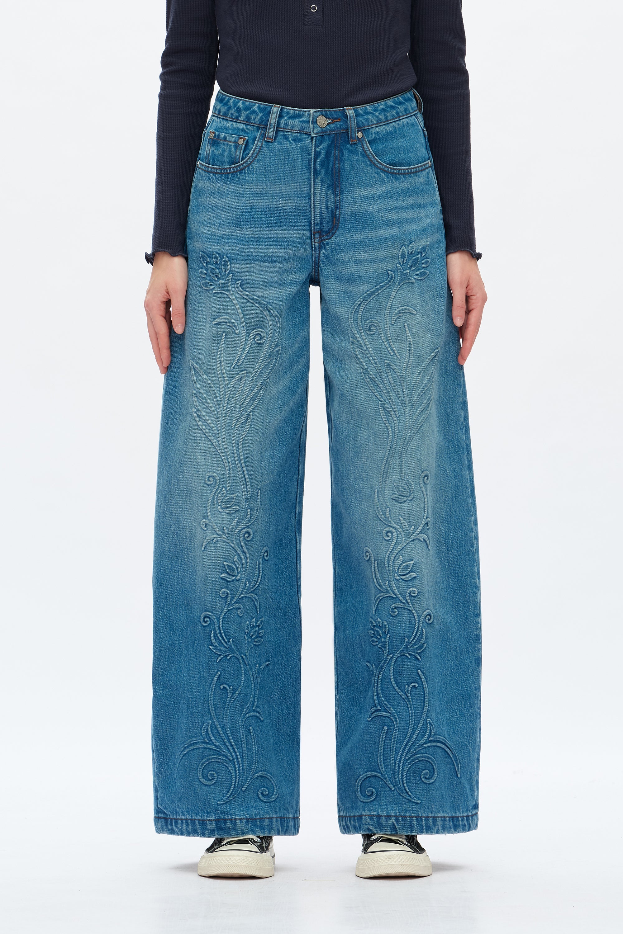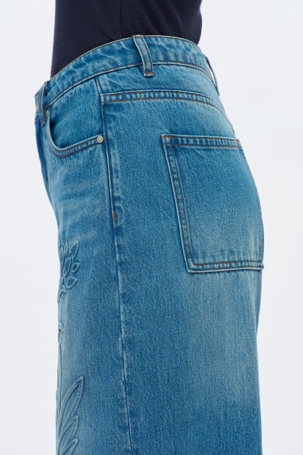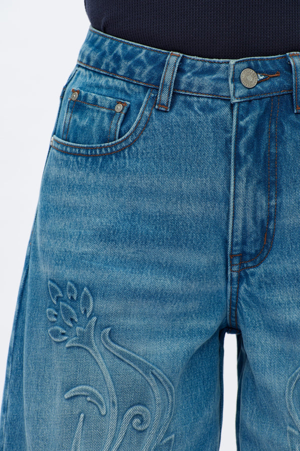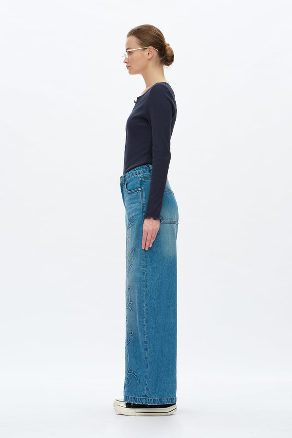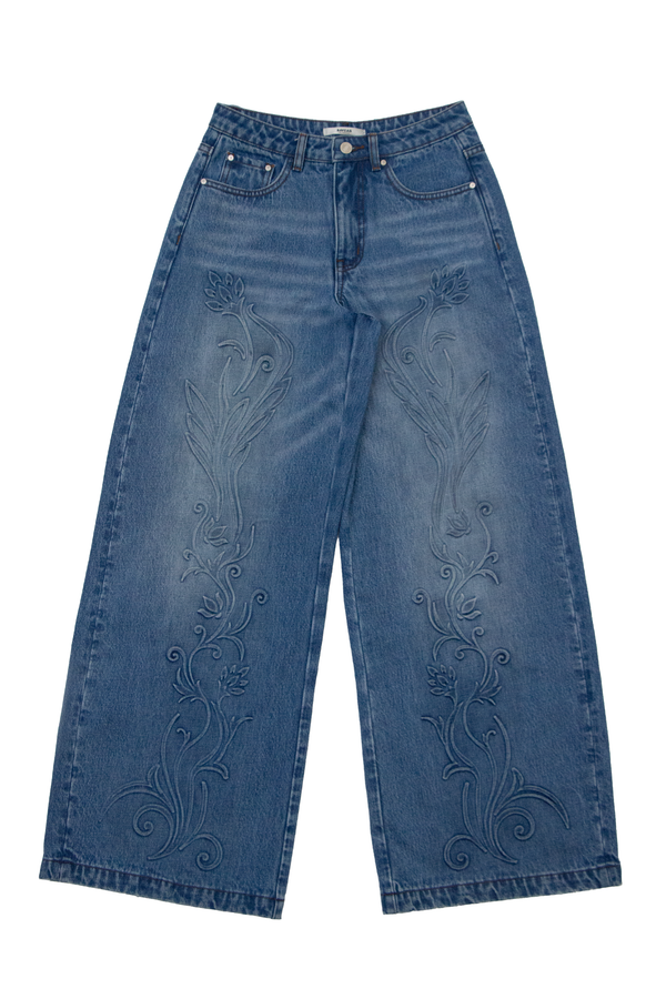 High rise wide leg jeans in medium blue with five pockets, a loose fit, 3D plant print on the front and hand-worn hems.