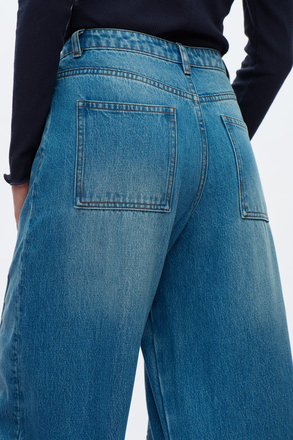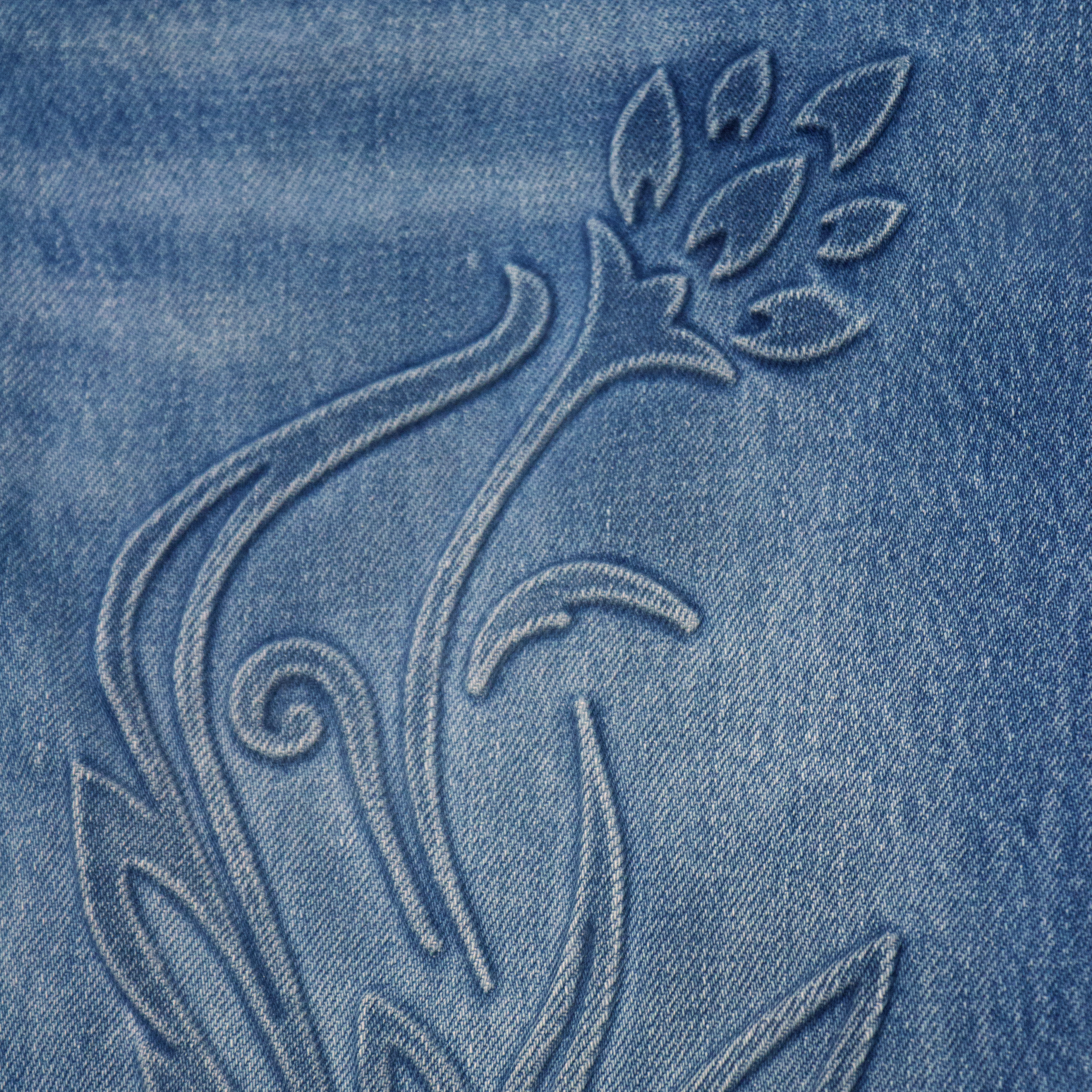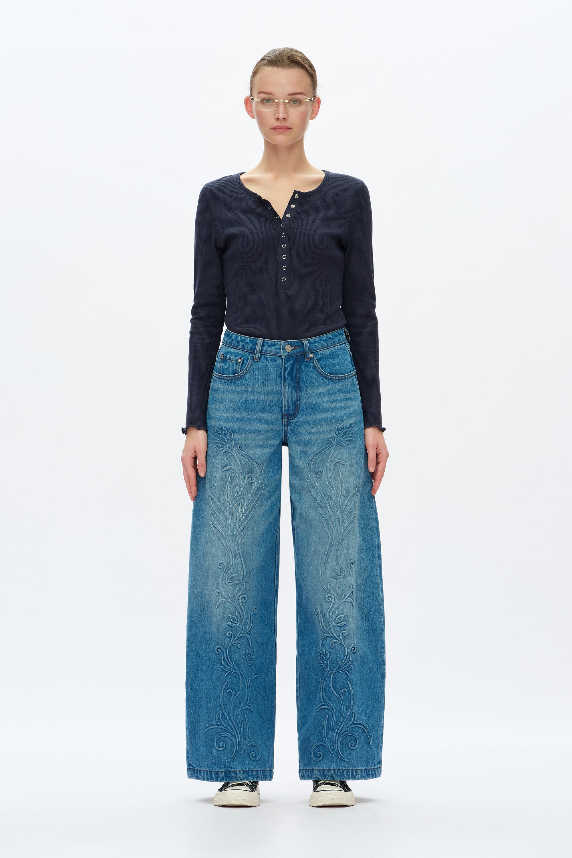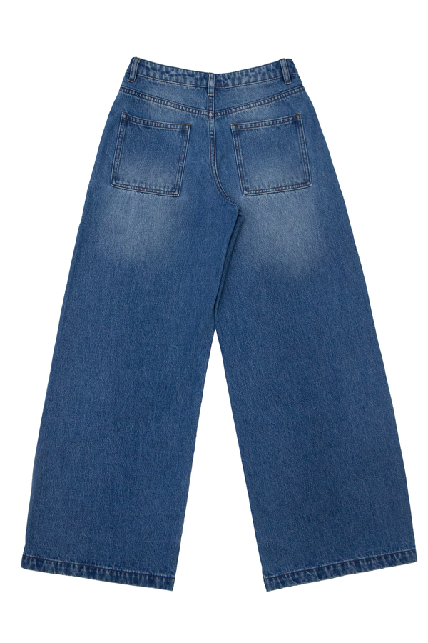 High rise wide leg jeans in medium blue with five pockets, a loose fit, 3D plant print on the front and hand-worn hems.