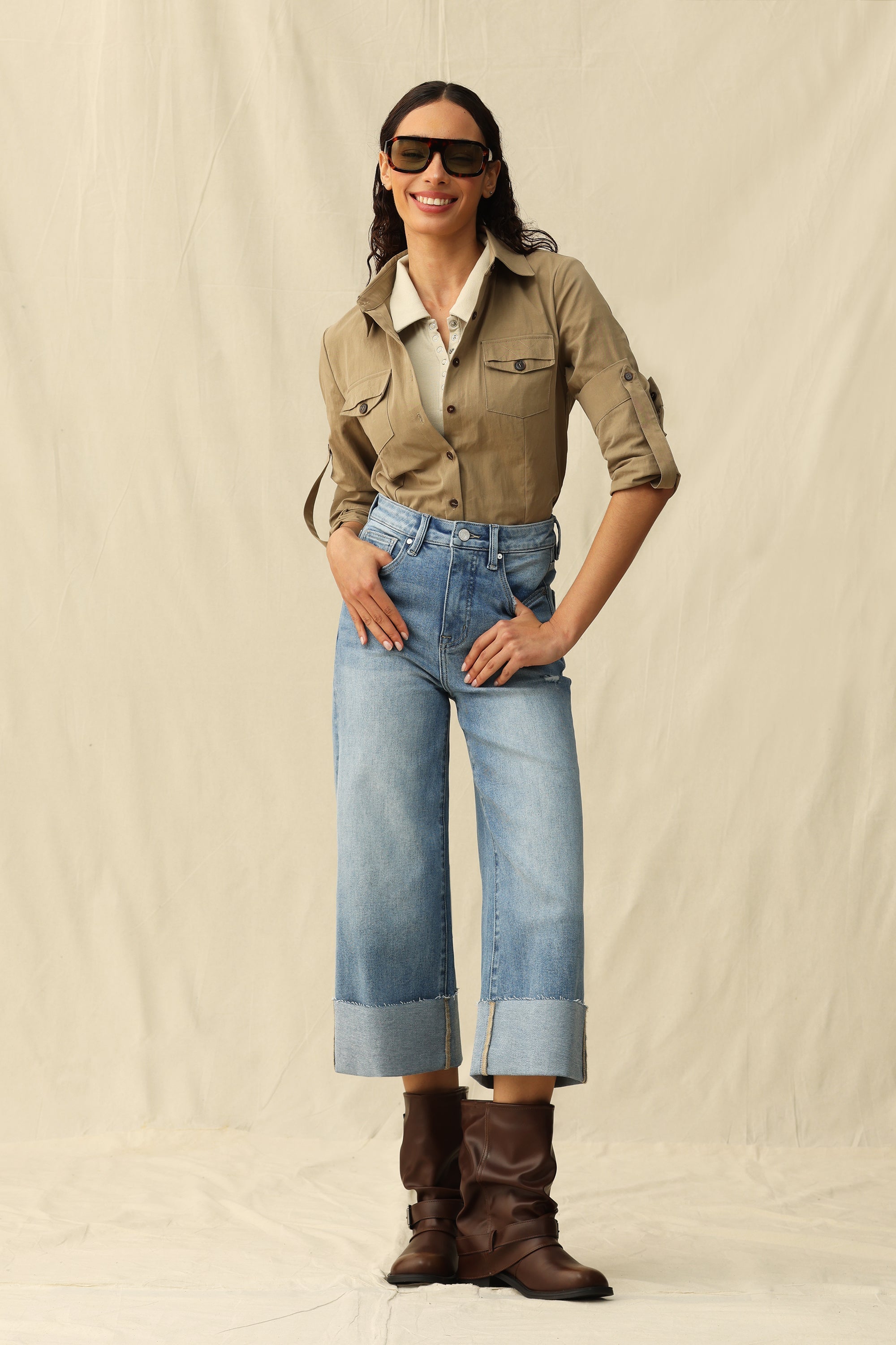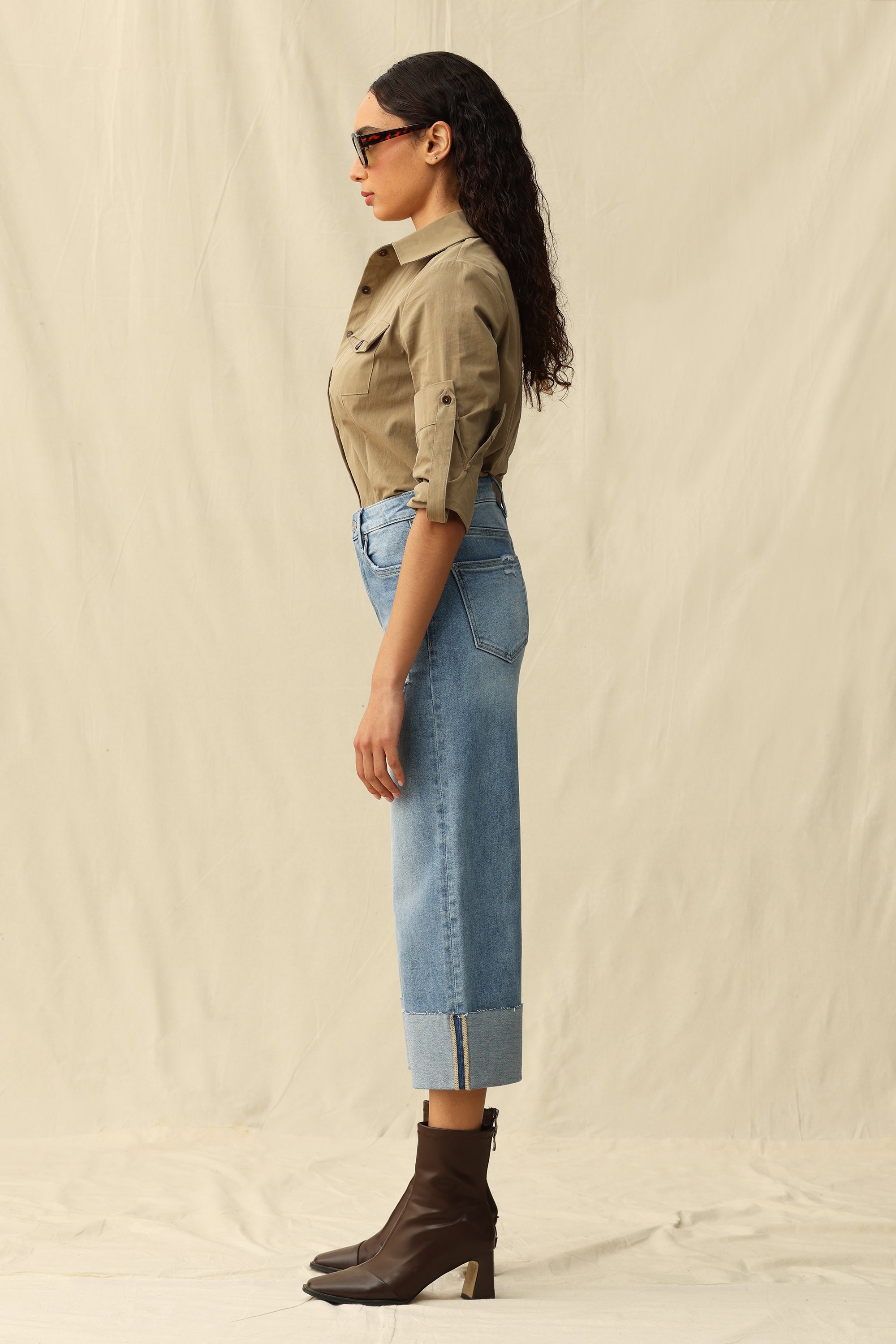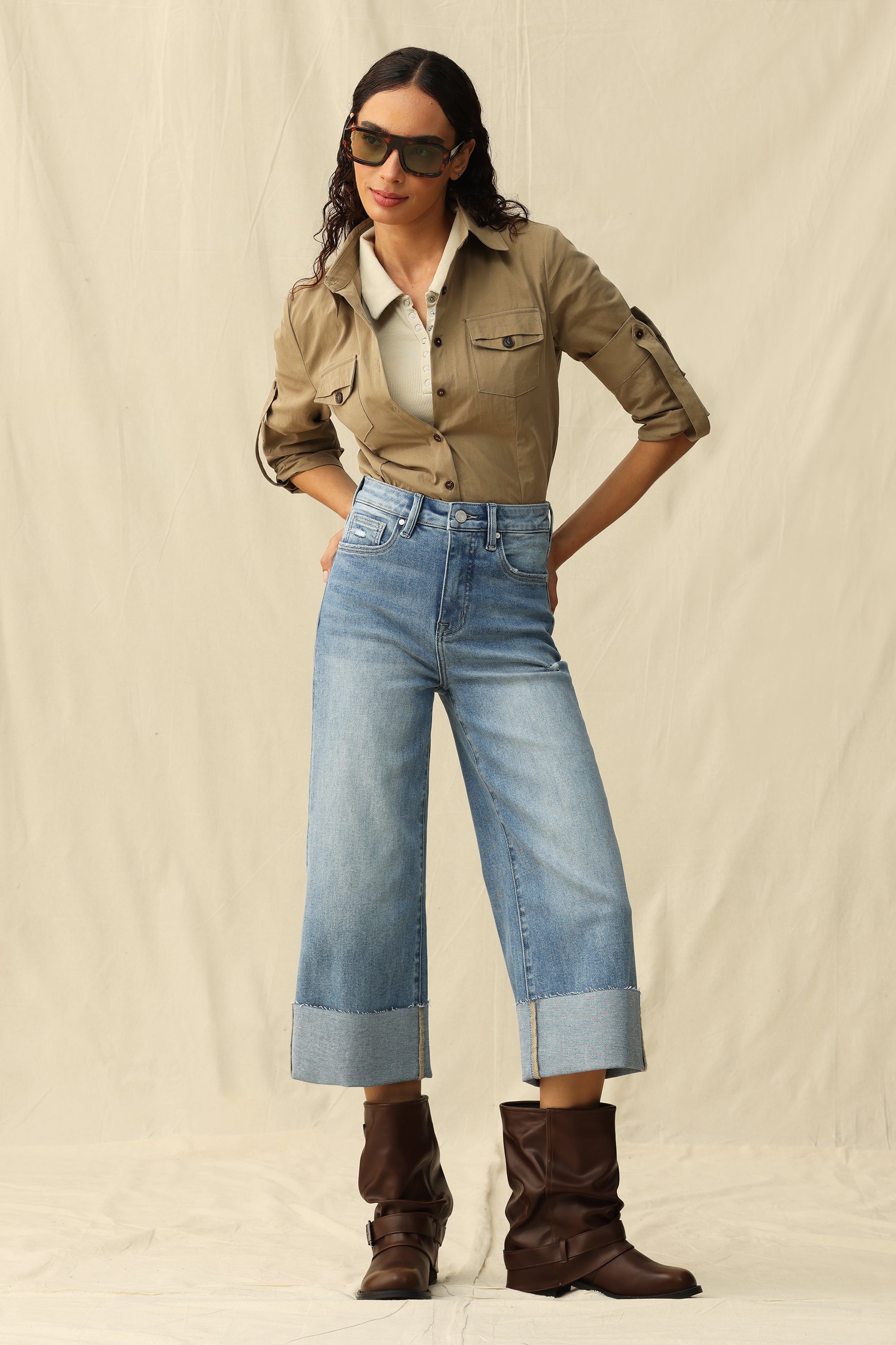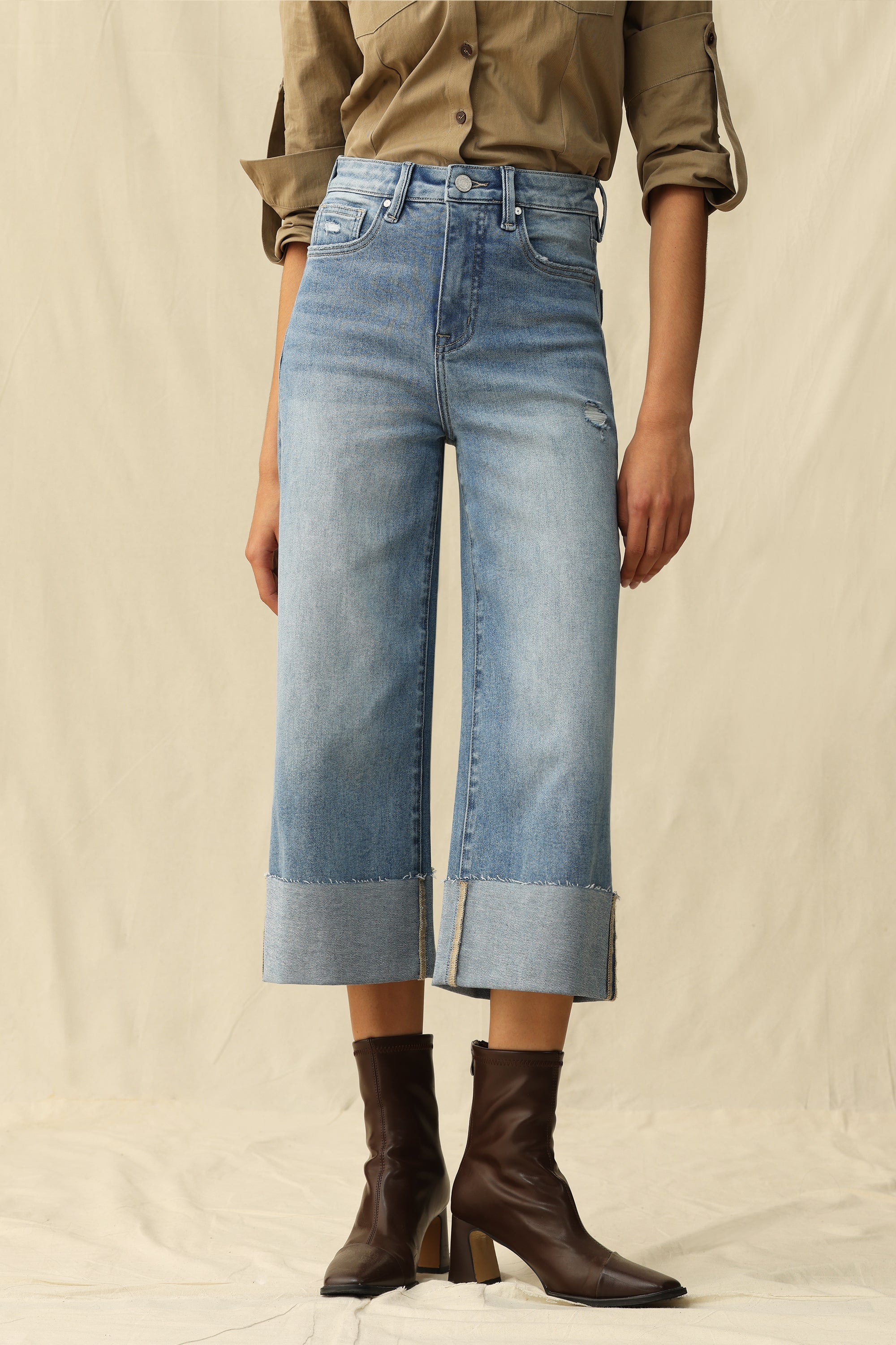 High rise cropped wide-leg jeans cuffed hems five pocket style mid-blue wash relaxed fit with good stretch.