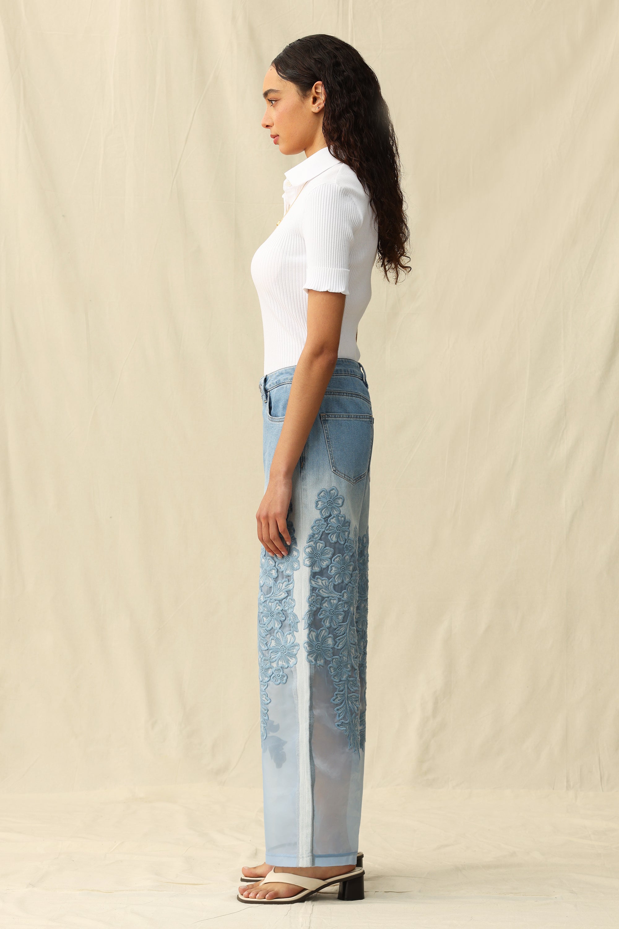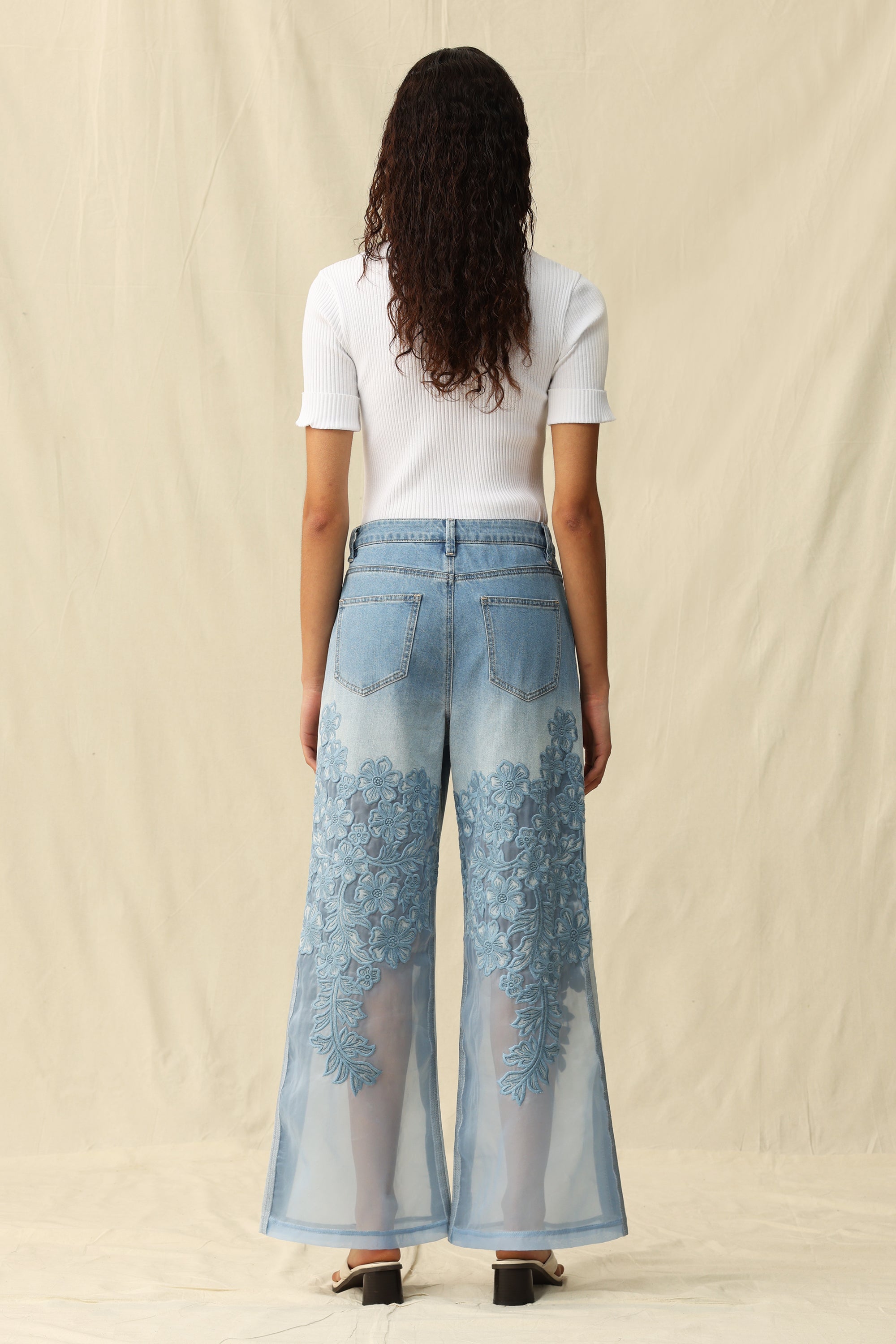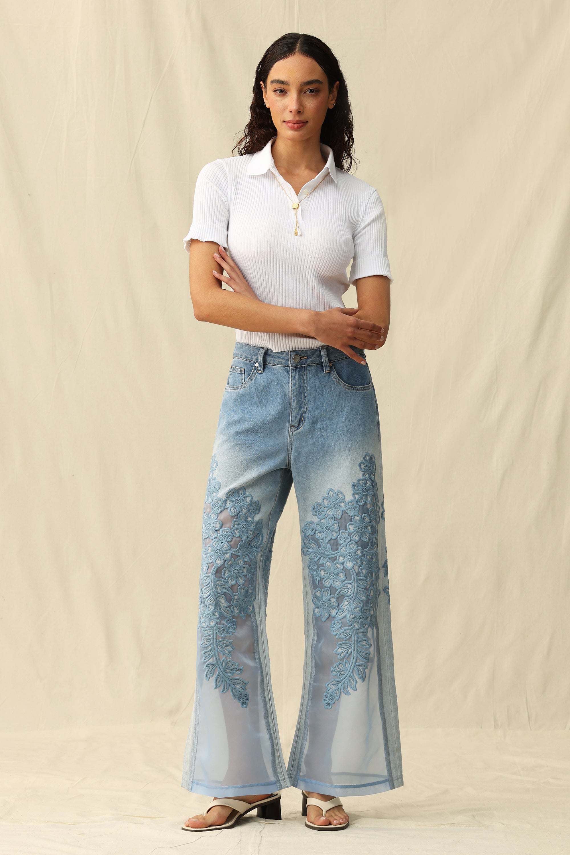 High-rise wide-leg jeans in a classic five-pocket style, featuring embroidered details and mesh fabric paneling.
