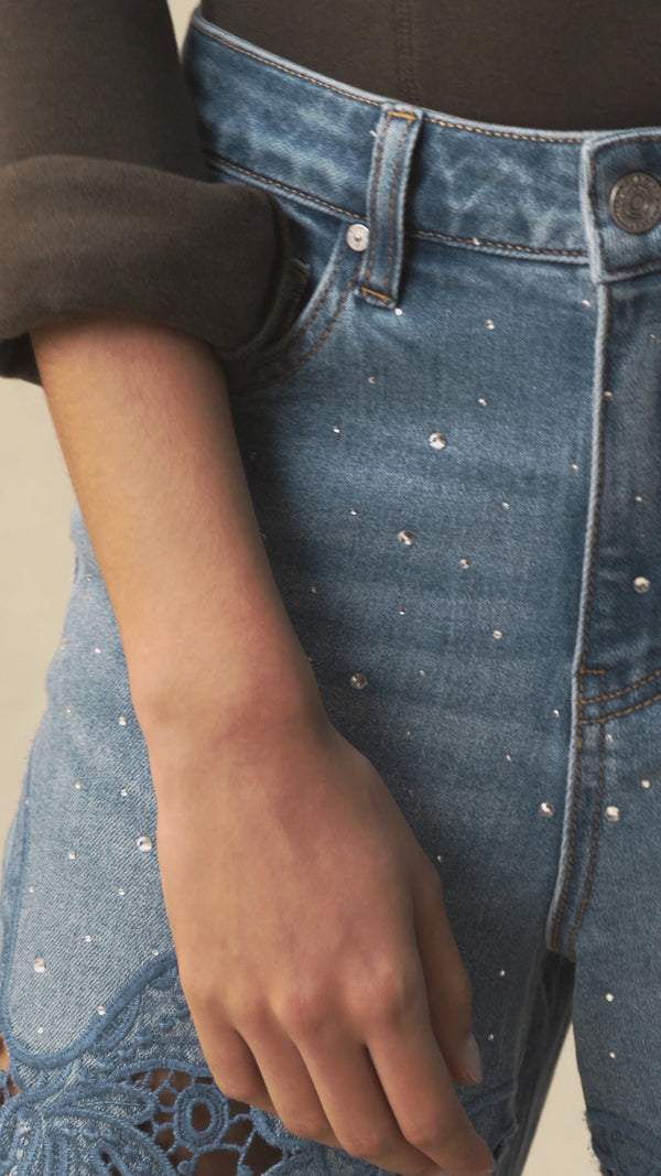 High rise wide leg jeans with rhinestone embellishments and floral motif embroidery to instantly showcase your personal charm.