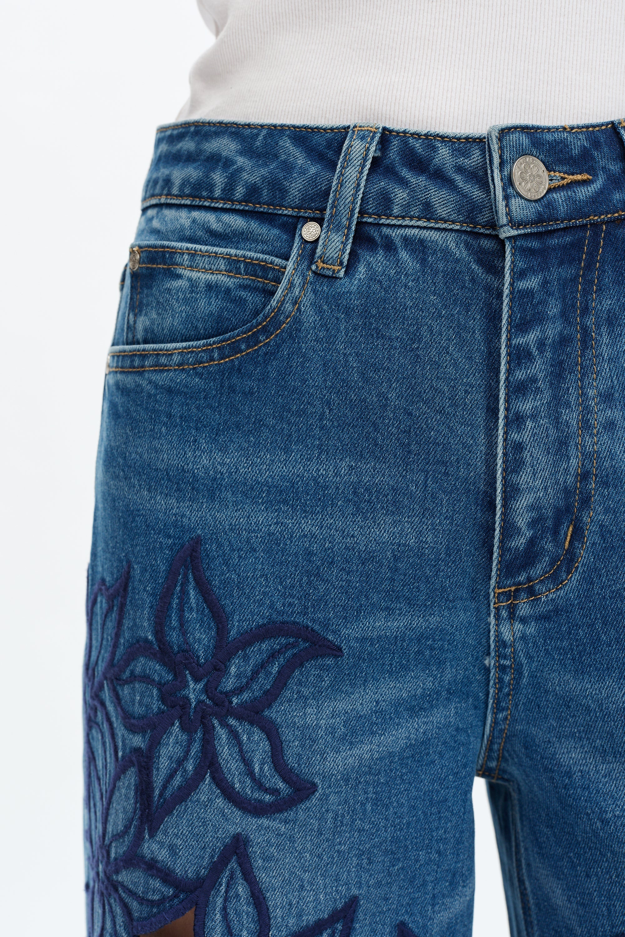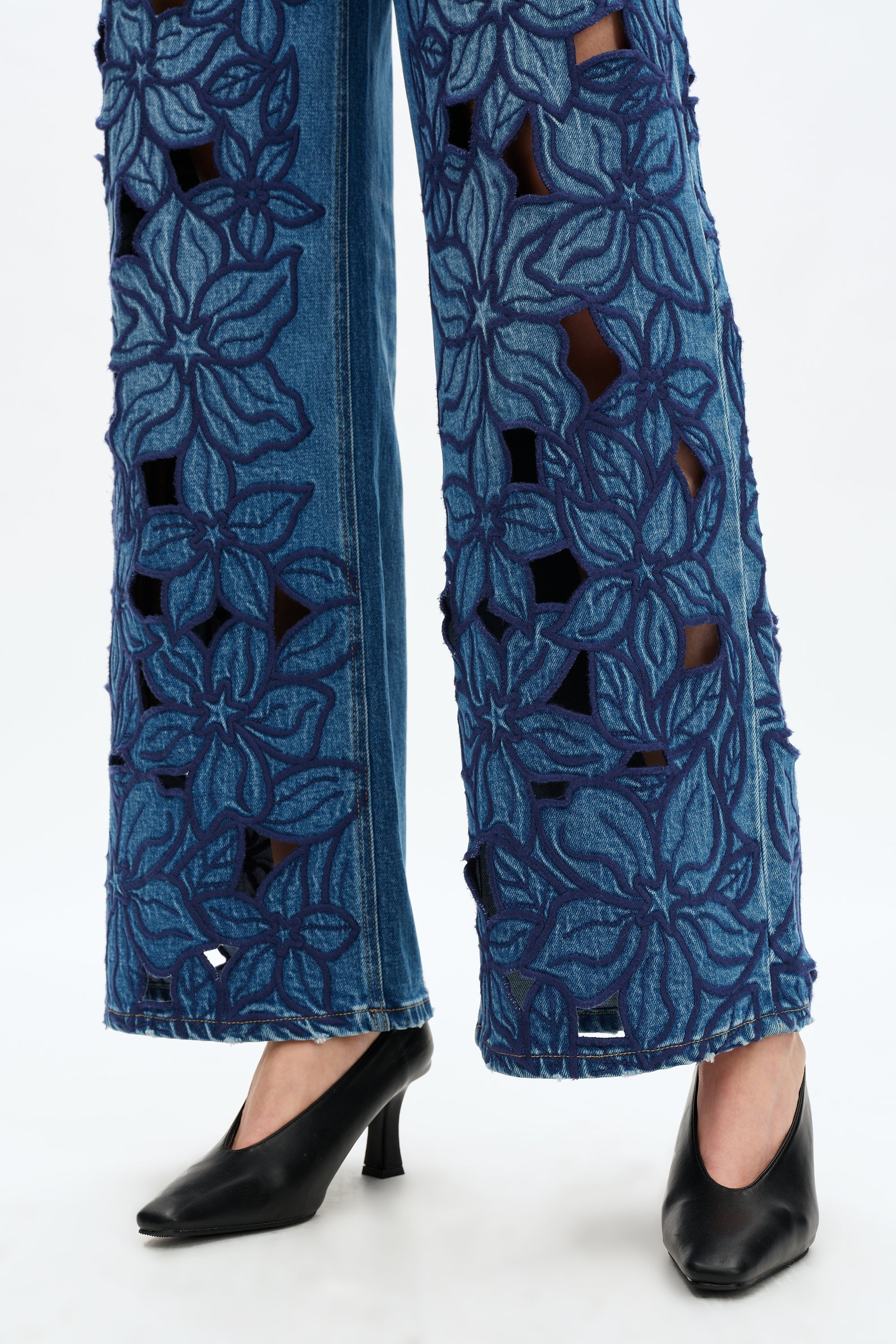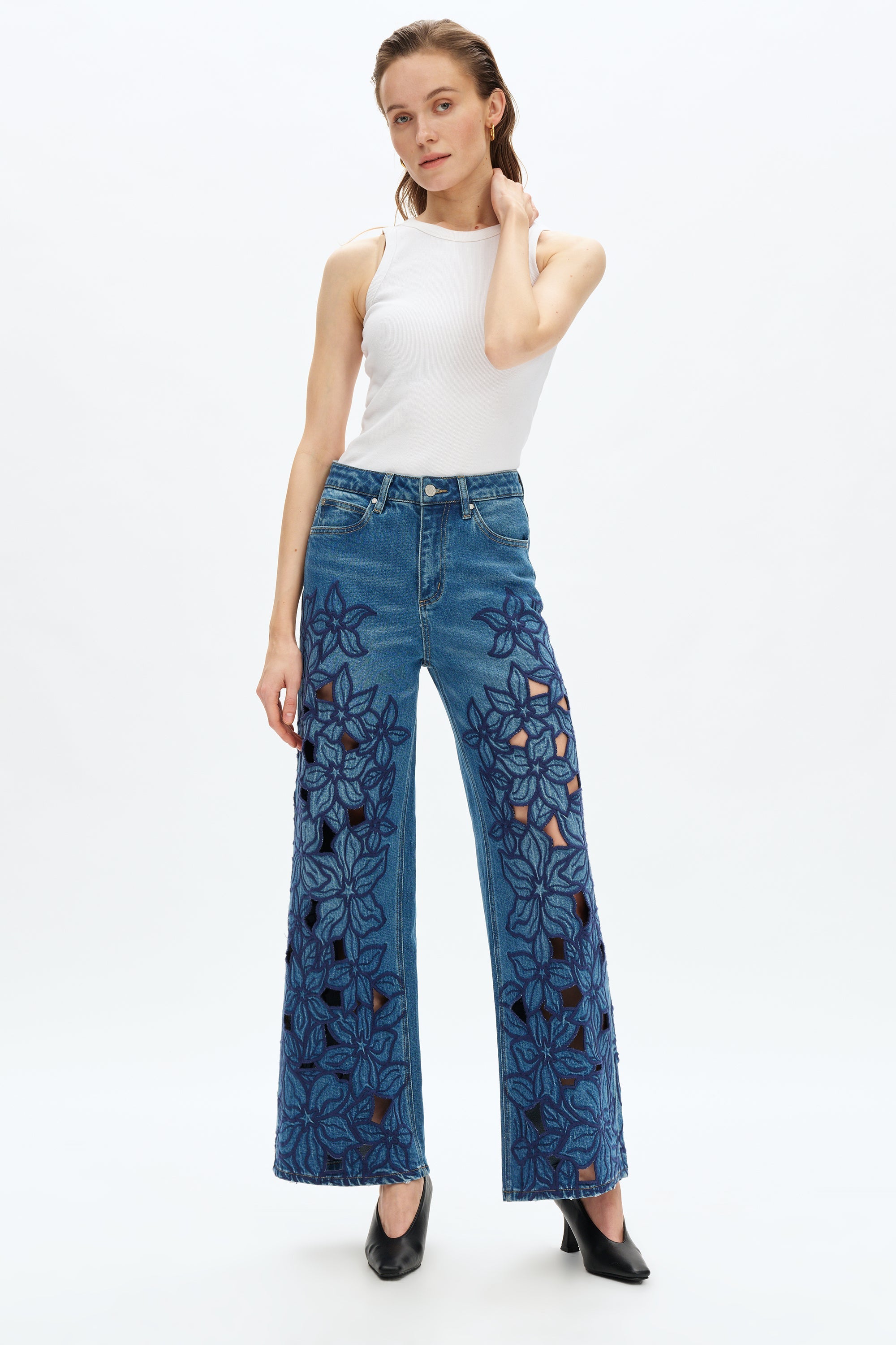 High-rise wide leg, the classic five-pocket style features exquisite washing effects, with elegant and dynamic embroidery patterns and cutout designs on the pant legs.