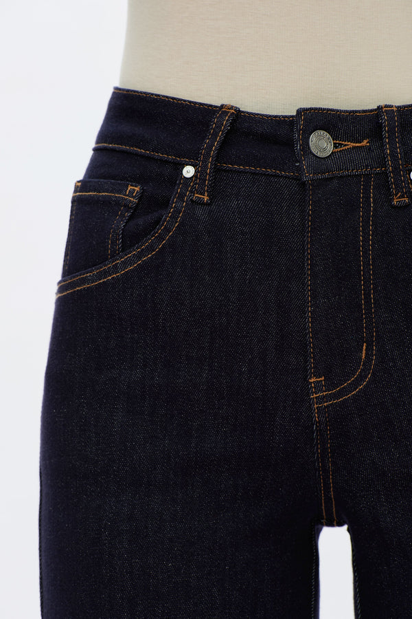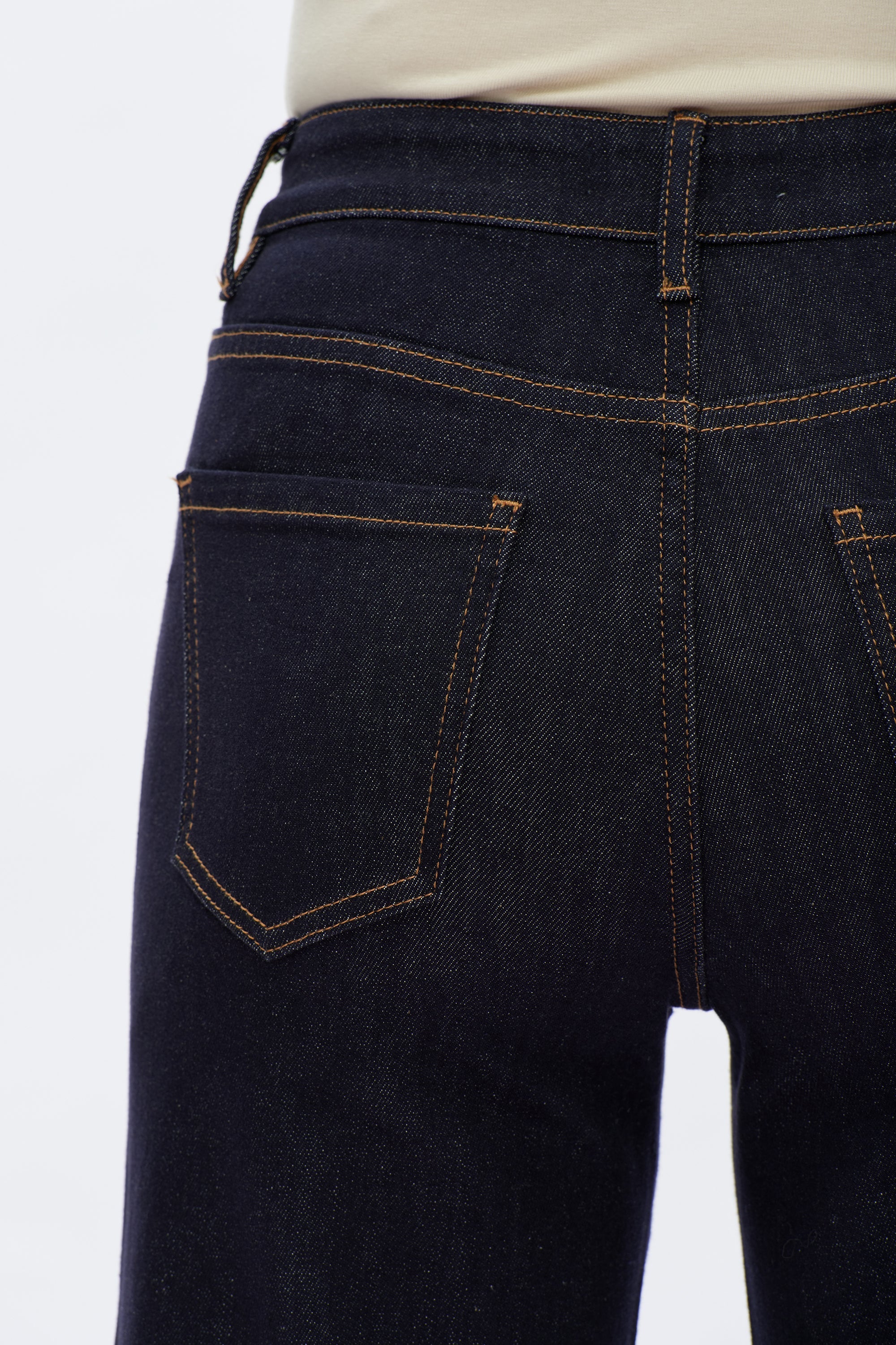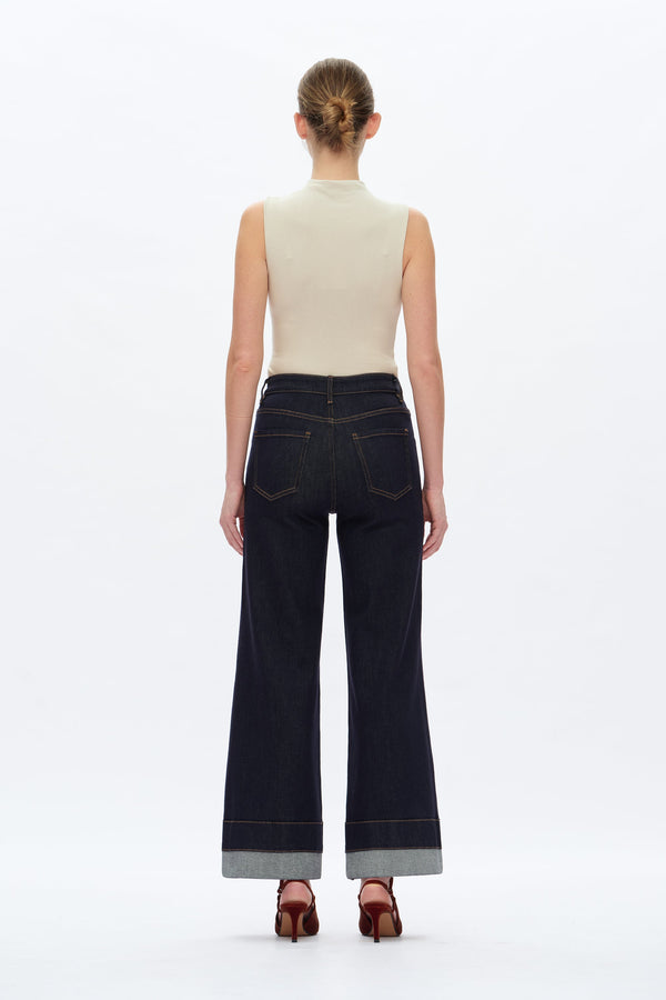 High-waisted raw wide leg jeans with cuffed hems, distinctive seam detailing, wide cuffs, and classic raw denim color.