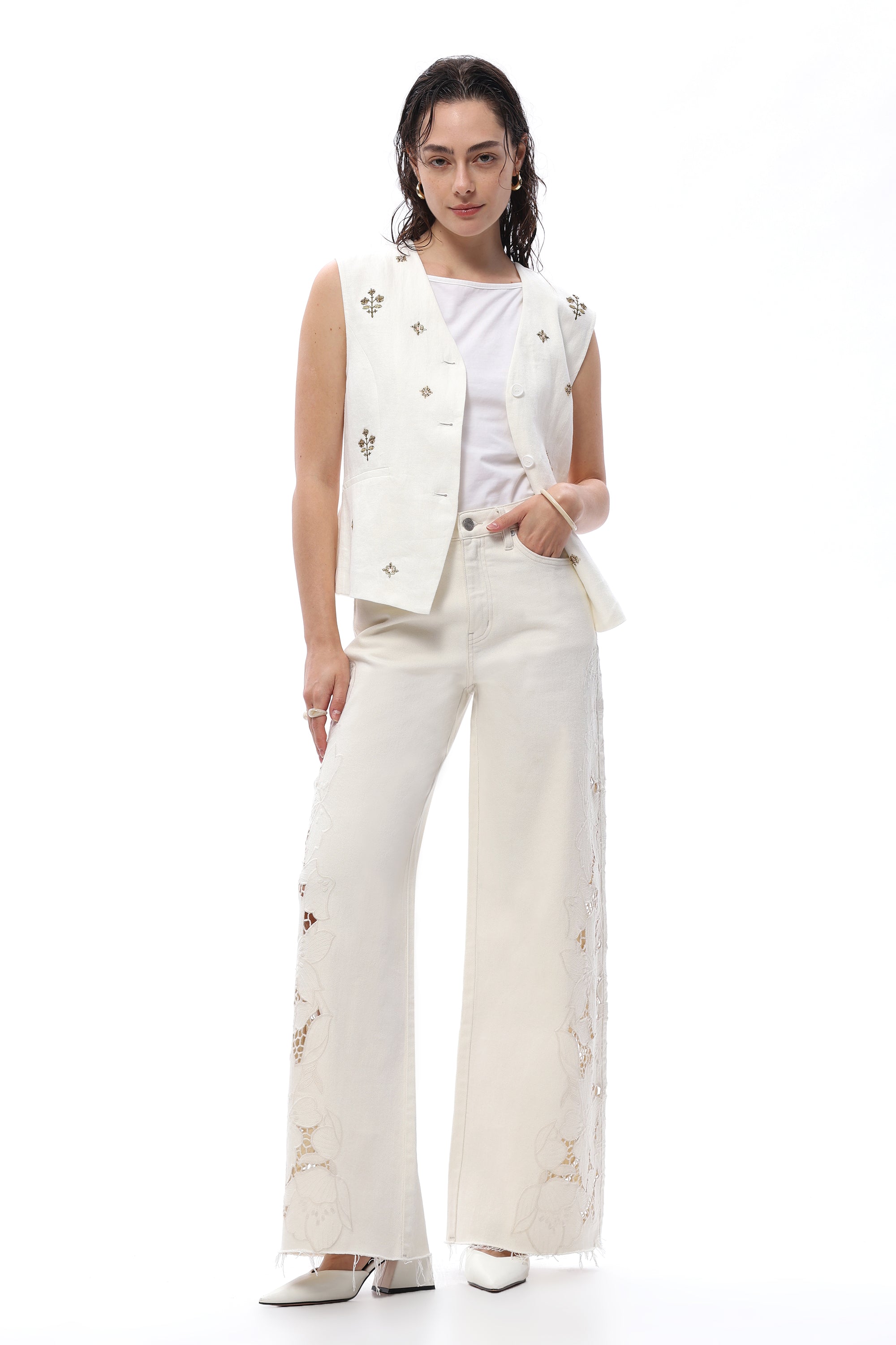 High rise wide leg jeans featuring curved square back pockets and back pleats in place of a yoke. The off-white base is accented with cutout embroidery along the side seams and hem, crafted from high-stretch fabric for a comfortable, body-contouring fit.