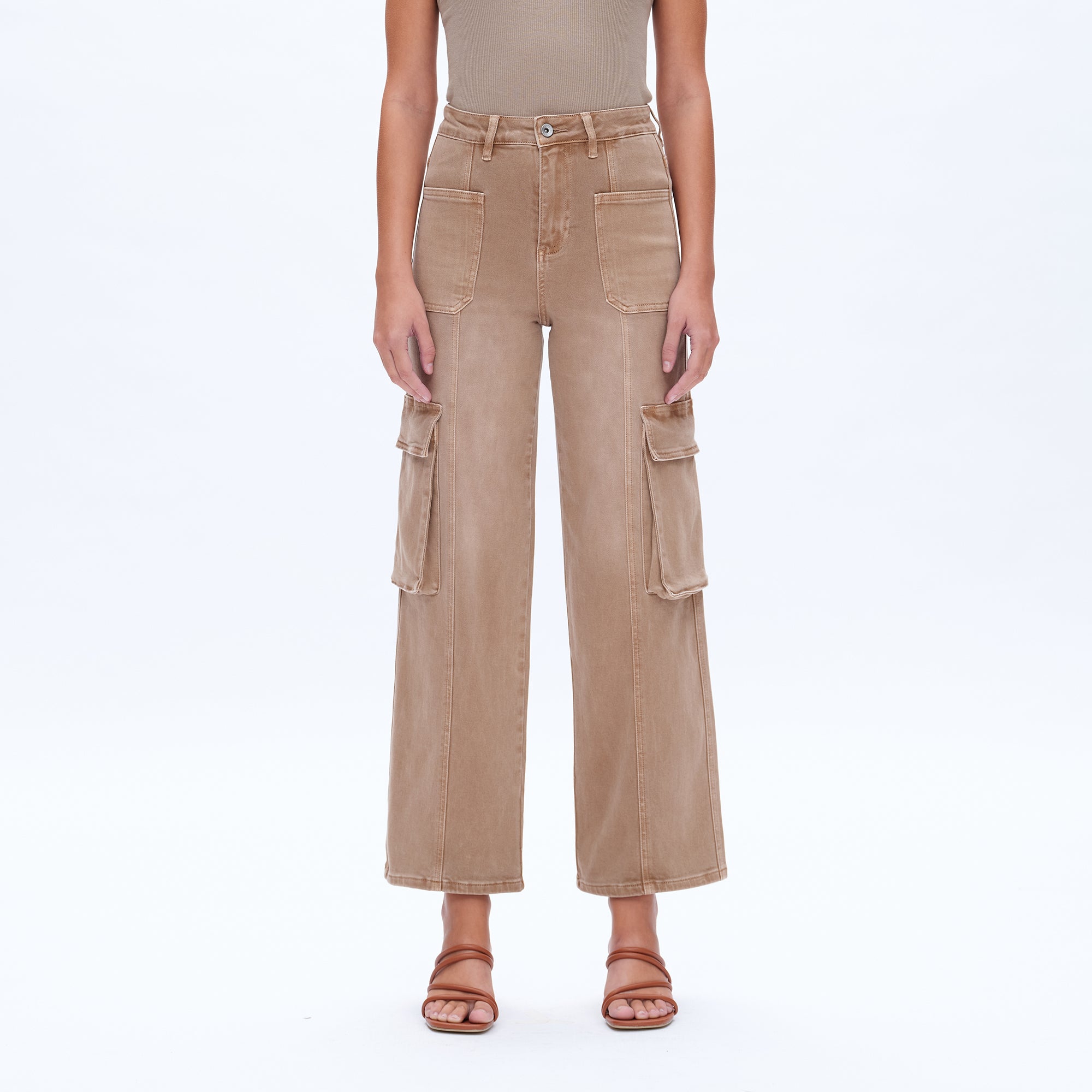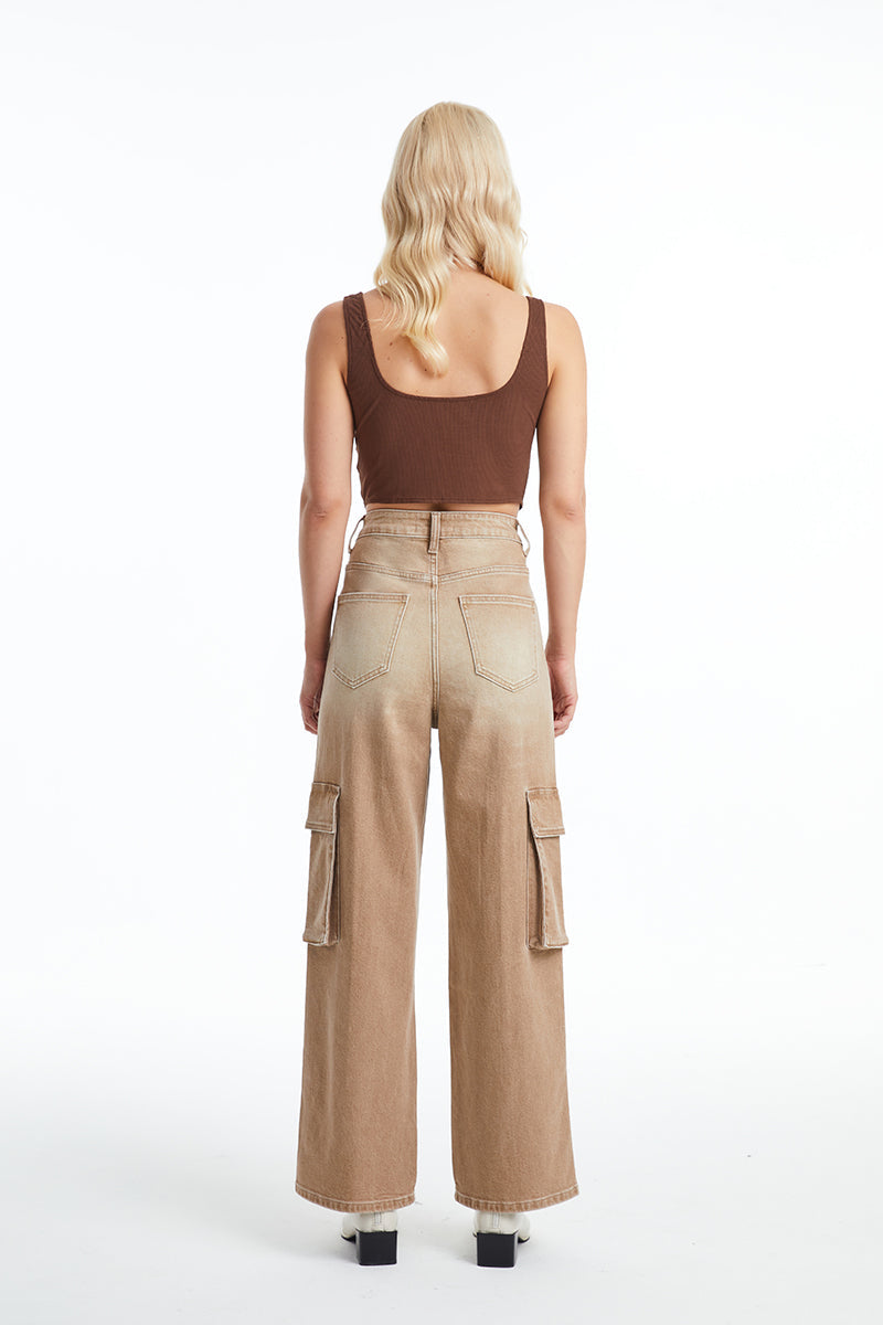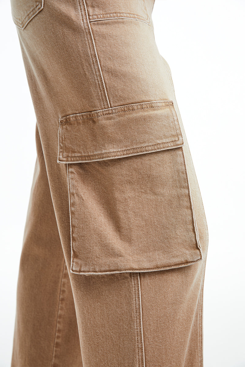 High-waisted wide-leg jumpsuit in a neutral wash. Features cargo pockets and front seam details for a modern, utility-inspired look.