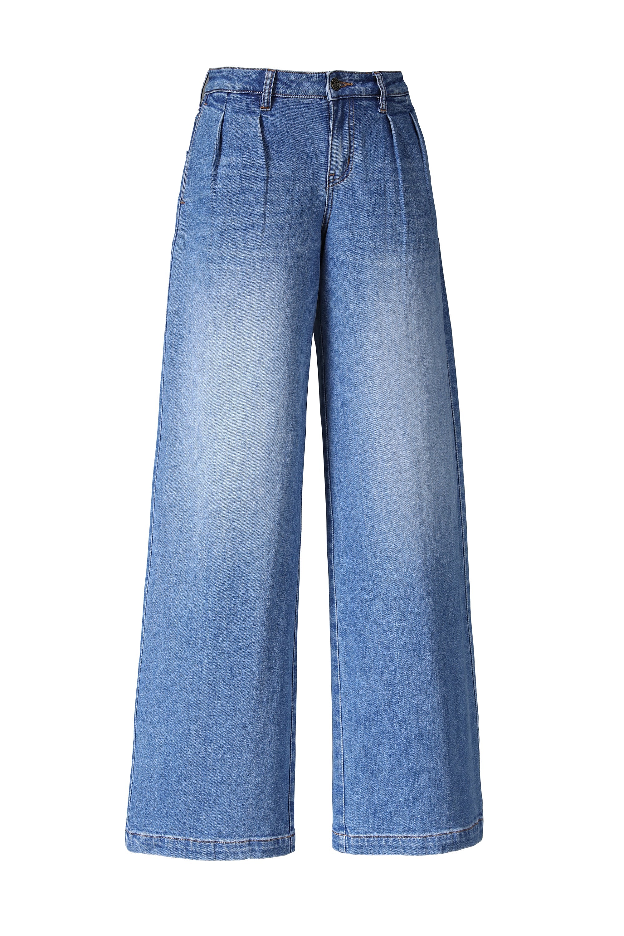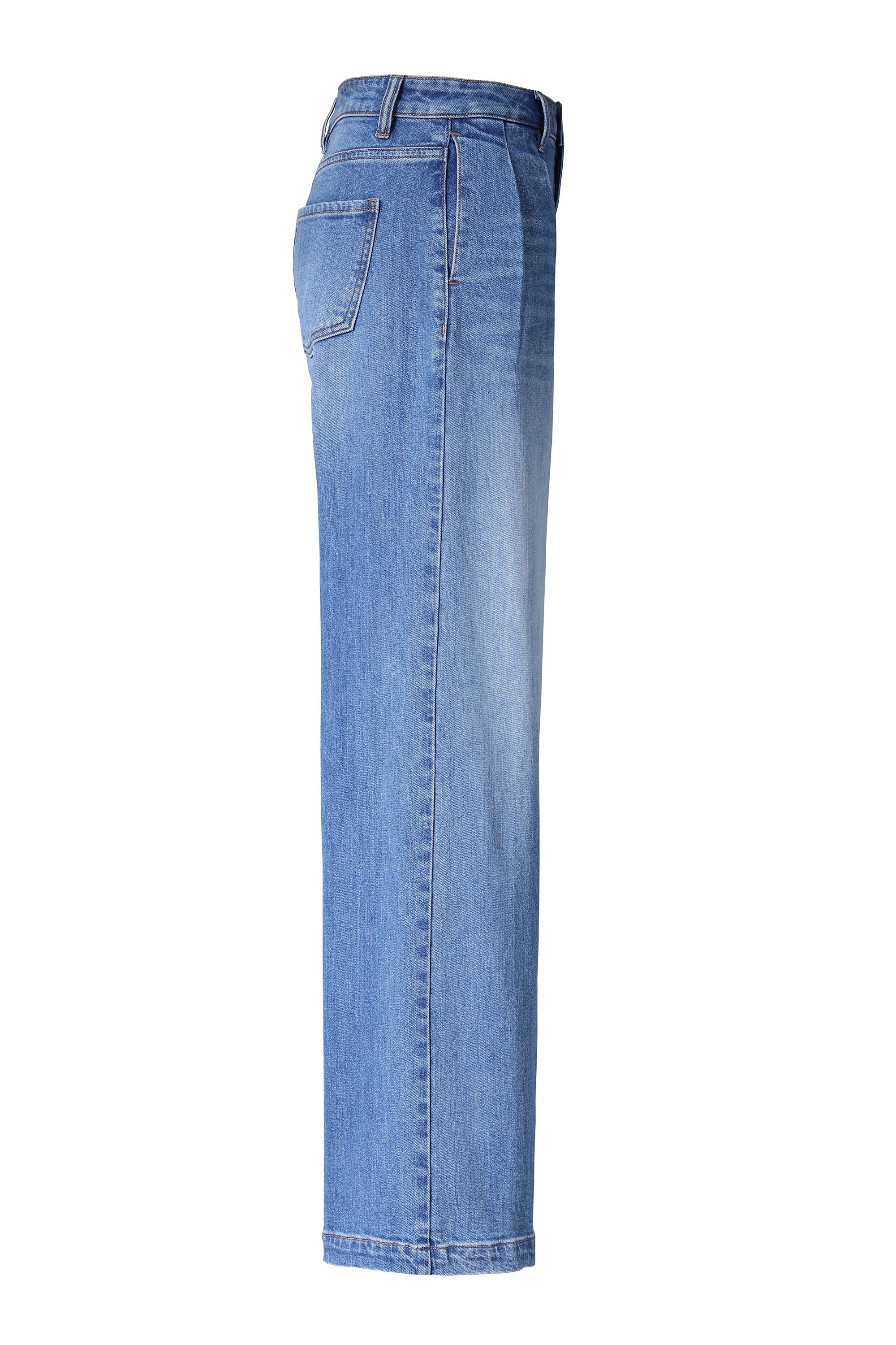 A relaxed, wide-leg cut with a mid-rise fit. The design includes front pleats and a unique two-tone denim wash that darkens toward the hem.